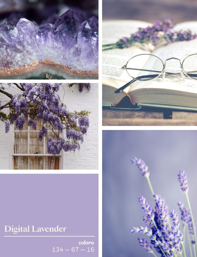 Digital Lavender se marie à merveille avec le gris, le beige, le blanc, le bleu et le rouge. On préfèrera le vert, le jaune, l’or et l’argent pour des combinaisons plus extravagantes.