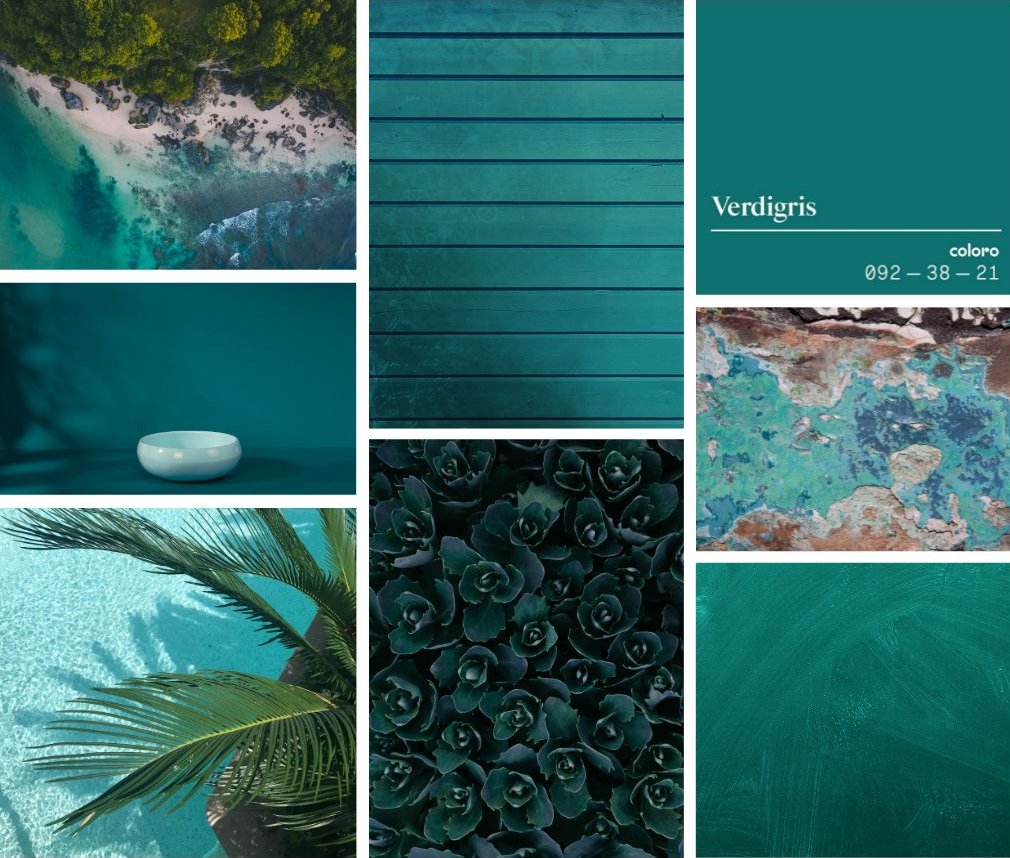 Verdigris est une couleur chaude qui doit son nom à un pigment verdâtre (vert-de-gris) se formant sur le cuivre quand il est oxydé. Sur la roue chromatique, Verdigris se situe entre le bleu et le vert et rappelle les vêtements de sport et de plein air des années 1980. La couleur évoque des sentiments nostalgiques et symbolise l’envie de retourner à la nature, l’insouciance et l’esprit d’initiative.