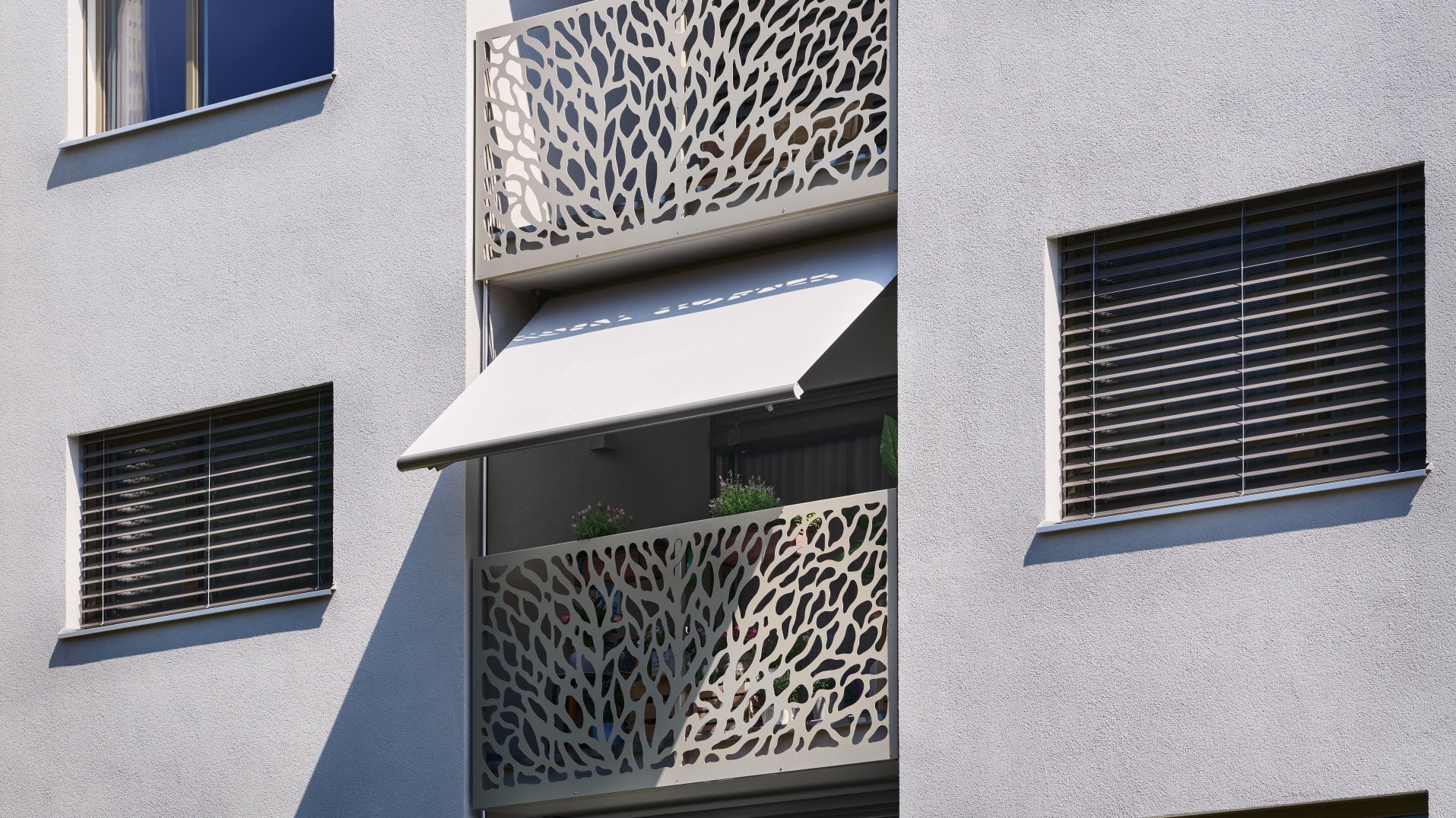 Comment intégrer des solutions d’ombrage robustes de sorte qu’elles n’altèrent pas l'esthétique de la façade et soient aussi discrètes que possible? Les stores des fenêtres ont été intégrés dans la façade comme prévu et en standard. Les stores bannes des balcons ont été délibérément décalés un peu vers l'arrière pour ne pas être perçus comme faisant partie de la façade. Les stores de l’étage attique ont été intégrés dans des galeries sur mesure dont la forme et la couleur rehaussent avec élégance l’esthétique de la façade.