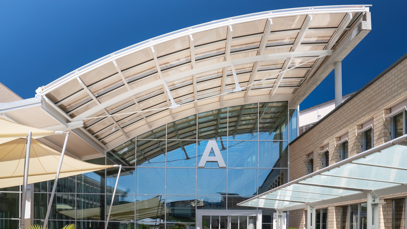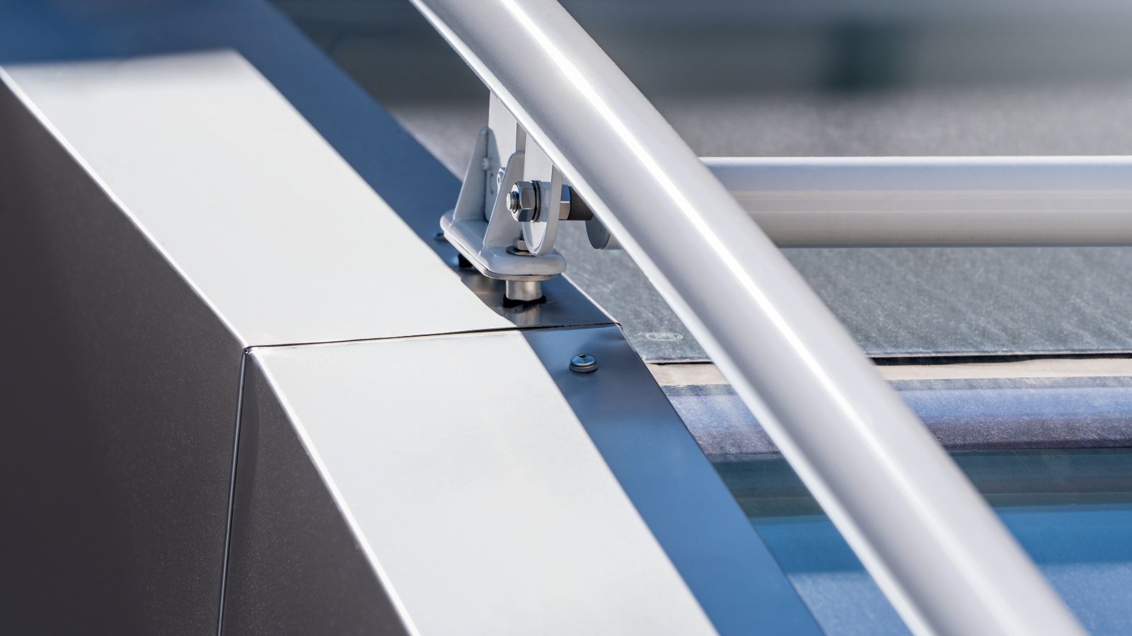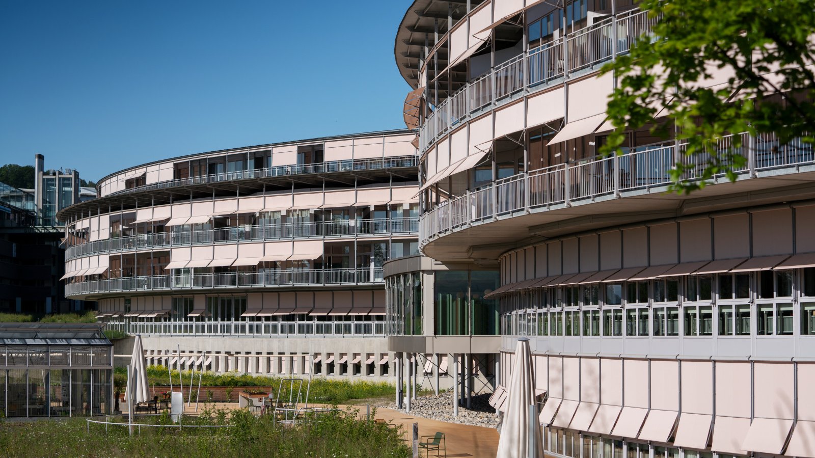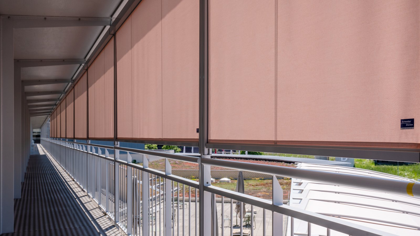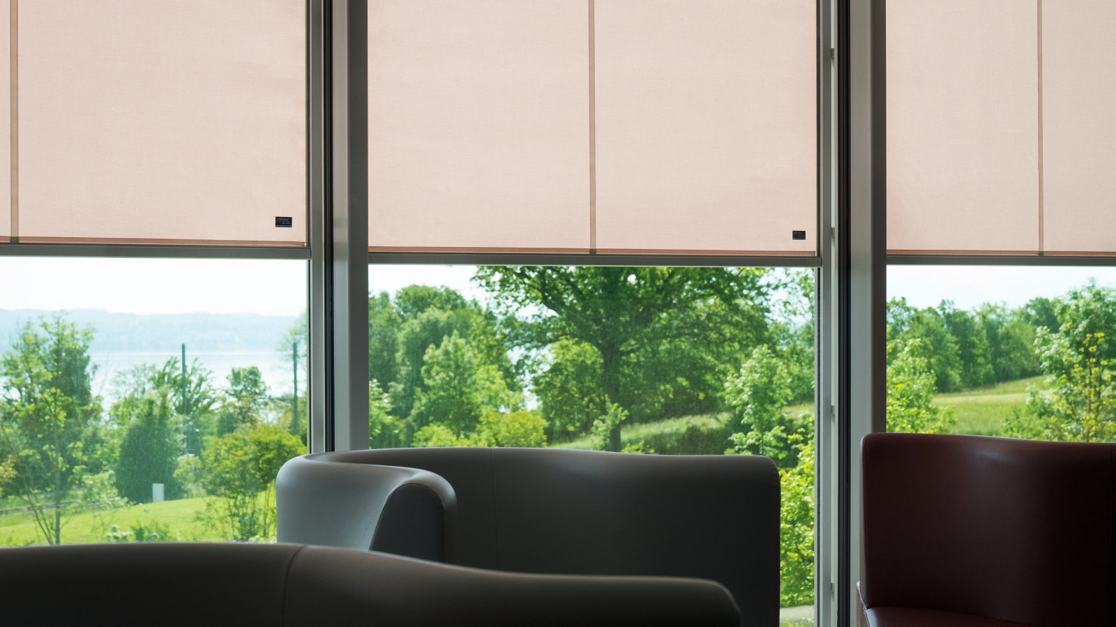 Pouvoir jouir d’une lumière naturelle suffisante est un facteur de bien-être décisif, surtout pour les patients. Et la façade presque transparente de l’extension est précisément conçue pour cela. Le «Casino» présente une architecture particulièrement frappante en raison de son plan arrondi et de ses grandes fenêtres panoramiques. Il fait office de zone de rencontre qui relie l’aile nord neuve à l’aile existante qui renferme les lits. Son toit cintré a été entièrement rénové dans le cadre du projet de construction, y compris l’ombrage. La marquise de façade FM 150 a été choisie dans ce but. Elle est idéale pour les endroits nécessitant des coulisses cintrées une ou plusieurs fois. Elle convainc en outre par son design élégant et compact et sa grande qualité. Pour un ajustement parfait, il a fallu adapter ici chaque coulisse exactement au rayon du vitrage situé en-dessous. Chaque store a par conséquent été dessiné en CAD sur base des plans en coupe du vitrage. Des stores en toile verticaux classiques résistants au vent VSe ZIP ont en outre été montés à l’étage situé pour ainsi dire au-dessus du Casino. Ils répondent eux aussi à des exigences très strictes en matière d’ombrage de grande superficie et d’esthétique. Ils étanchéifient non seulement parfaitement sur les côtés – favorisant ainsi au besoin un bon obscurcissement et un sommeil réparateur – mais ils améliorent aussi considérablement le bilan énergétique et la climatisation grâce à leurs toiles haute performance.