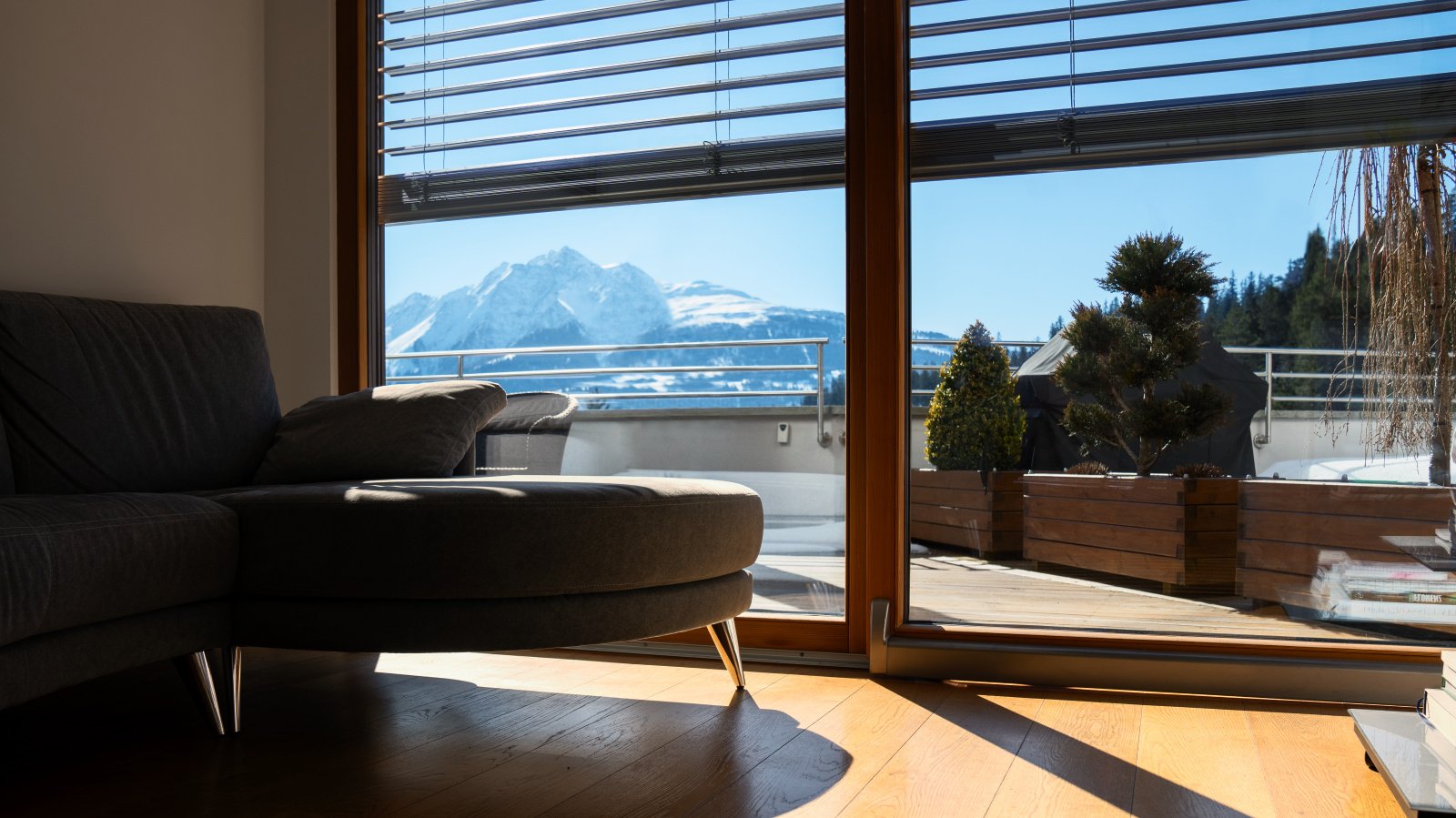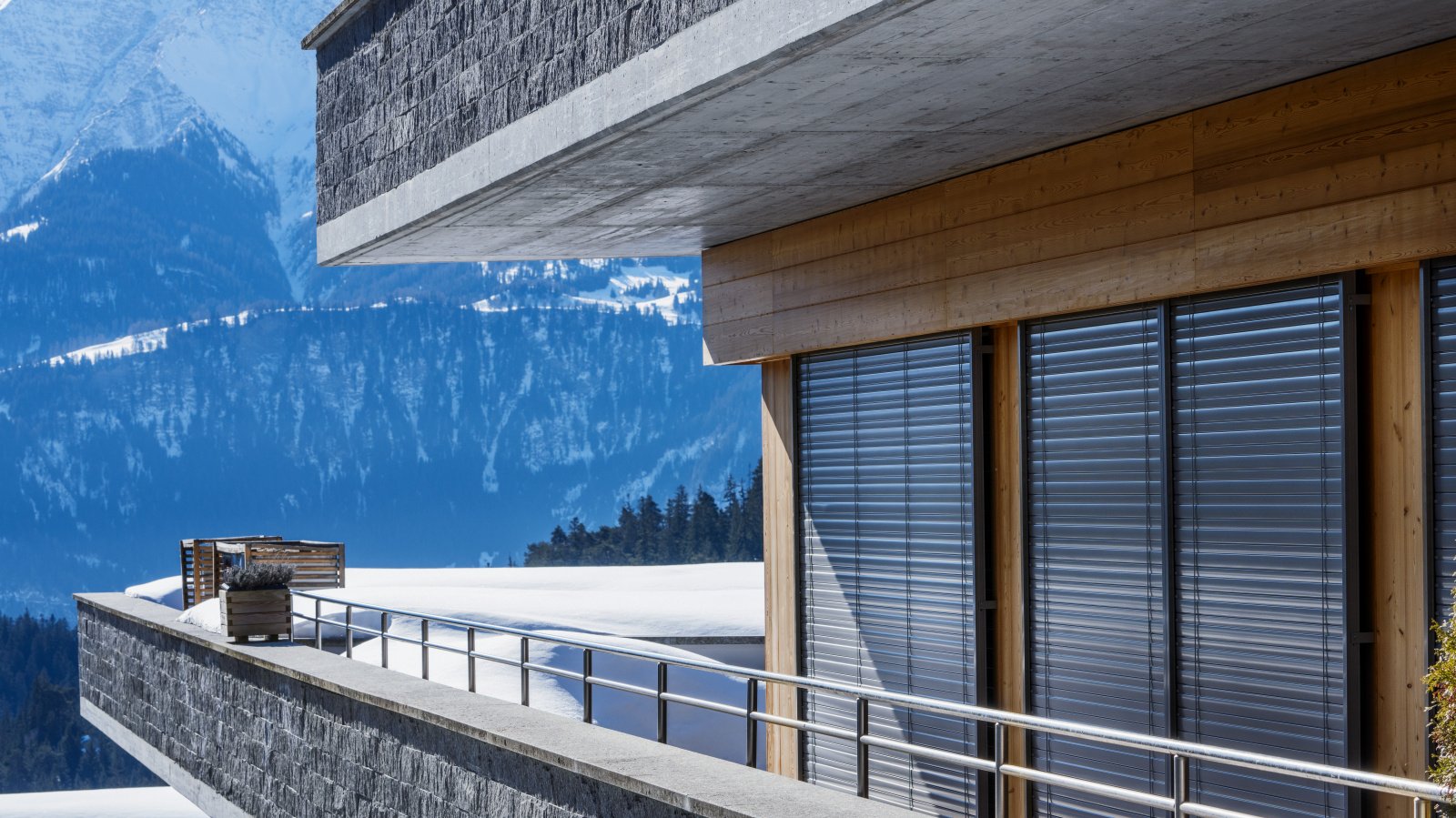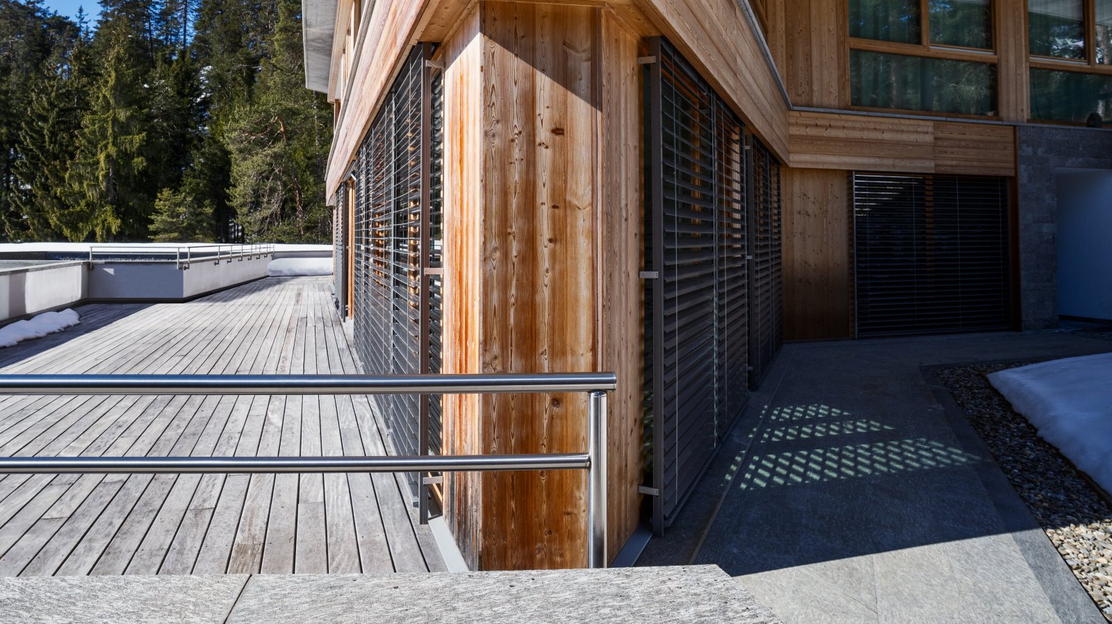 Le store métallique à lamelles reliées MV 90, un système d’ombrage raffiné et sophistiqué, est utilisé ici et s’harmonise avec l’apparence luxueuse de la résidence. Le guidage de courroie de qualité exigeant peu d’entretien est intégré latéralement aux coulisses. Comme aucune bande de relevage ne passe dans les lamelles, le store garantit un excellent obscurcissement et une isolation thermique maximale. La forme spéciale de ses lamelles permet de régler précisément et en continu la lumière passant au travers du store métallique à lamelles reliées. Le gris aluminium des lamelles choisi ici s’harmonise avec la façade en pierre naturelle et en bois. La situation de la résidence à l’orée de la forêt offre beaucoup de tranquillité et d’intimité, ce qui présente un grand avantage. Comme il s’agit de logements de vacances, une attention accrue a été accordée à la protection contre les intrusions. Le MV 90 est également un excellent choix pour cette raison. Il est verrouillé dans n’importe quelle position intermédiaire grâce à un système de verrouillage contre la remontée. Combiné à un guidage spécial des lamelles, il répond à des exigences de sécurité accrues grâce à sa technique de verrouillage active.