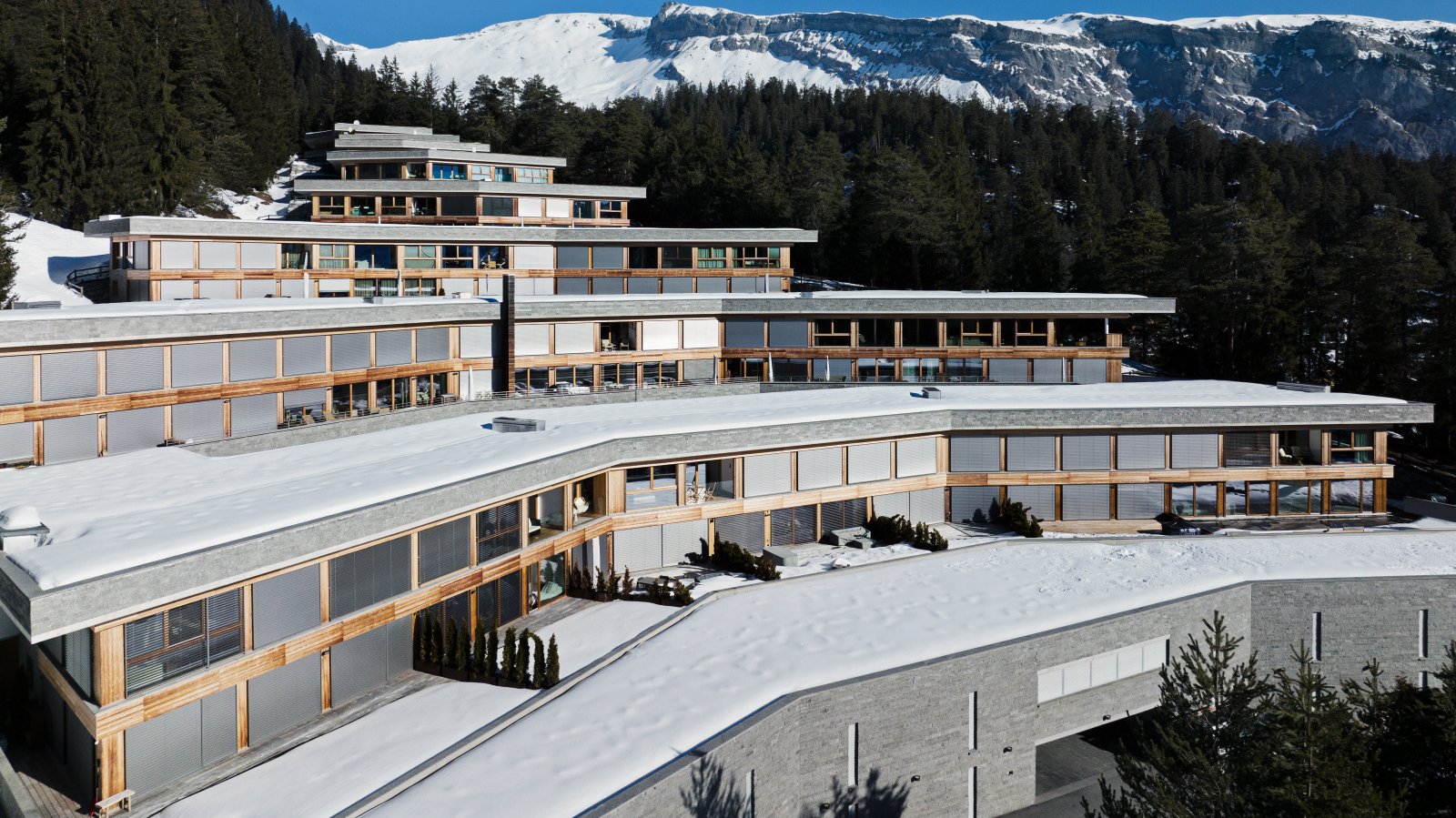 La magnifique résidence de vacances «Cuolm Liung», qui compte en tout 94 appartements et 15 étages que l’on atteint notamment avec un ascenseur incliné, trône sur les hauteurs de Laax-Murschetg. Aménagé en terrasses et niché dans le paysage, l’édifice bénéficie d’une exposition plein sud et séduit par sa vue incomparable et des appartements parfaitement ensoleillés. L’architecture élégante reflète les qualités naturelles environnantes par le biais de matériaux haut de gamme comme la pierre naturelle et le bois de mélèze.