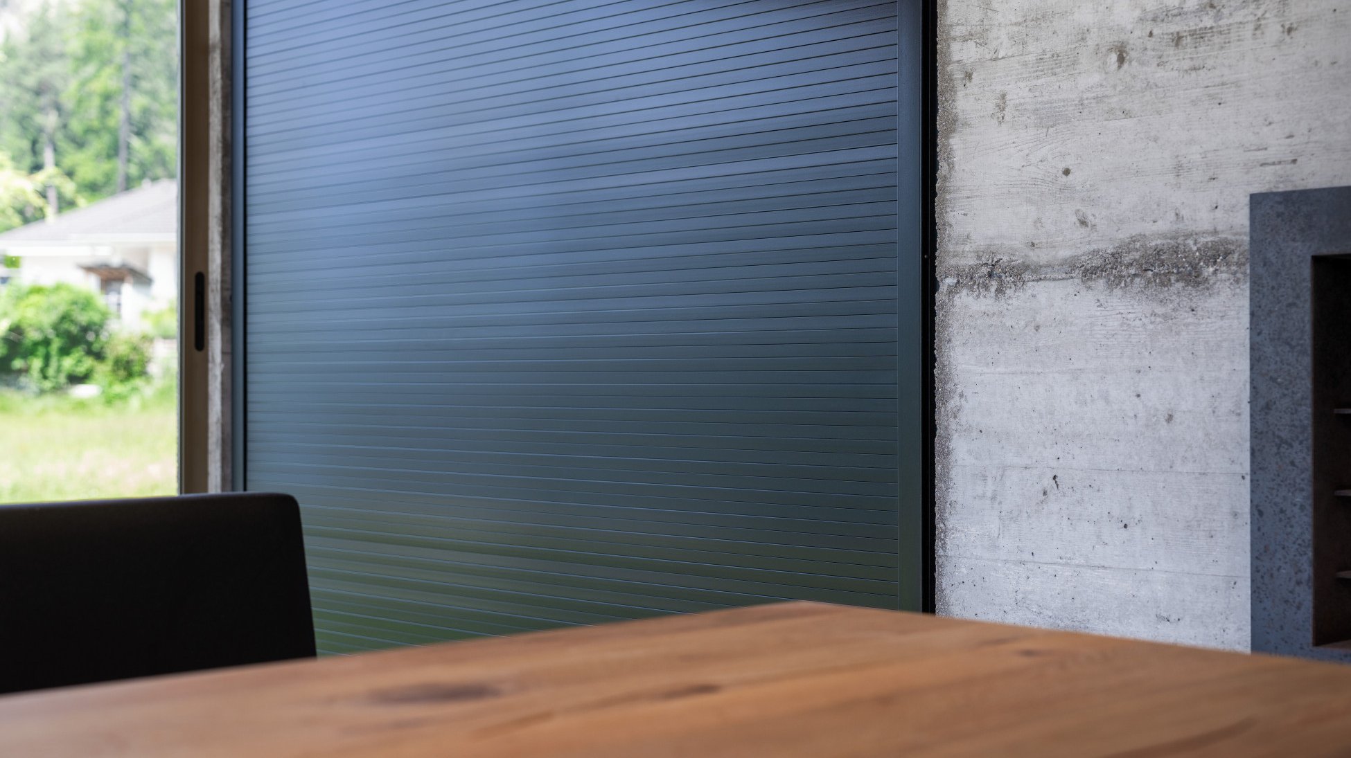 Des volets roulants de sécurité SRL 41 ont été installés pour protéger les zones extérieures non verrouillables. Ces éléments fabriqués à partir de profils en aluminium extrudé sont extrêmement stables et pratiquement inviolables. Des coulisses latérales renforcées assorties d’une protection contre l’action d’un pied-de-biche accroissent en outre la sécurité. Pour une apparence uniforme, les coulisses ont été noyées directement dans le béton sous forme de joints creux. Deux panneaux triangulaires à fleur en aluminium thermolaqué au-dessus des volets roulants offrent une finition élégante qui se fond harmonieusement dans la façade.