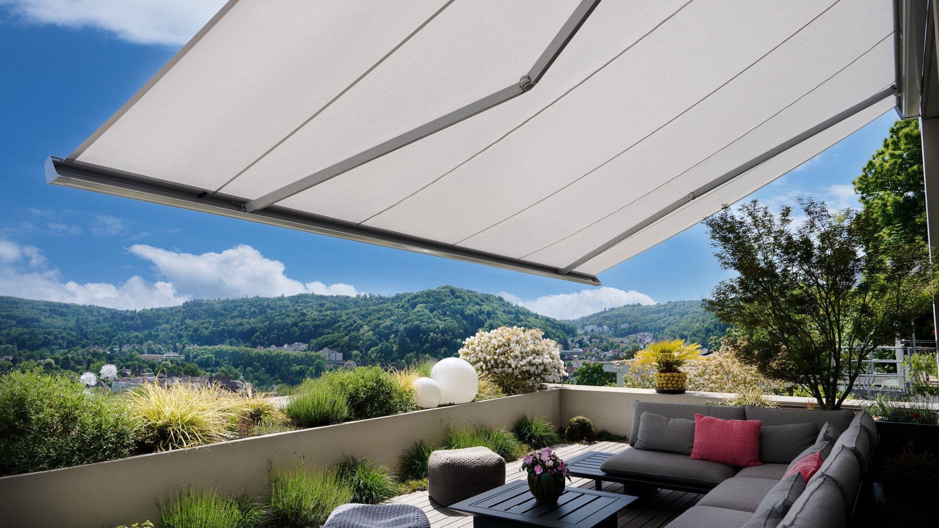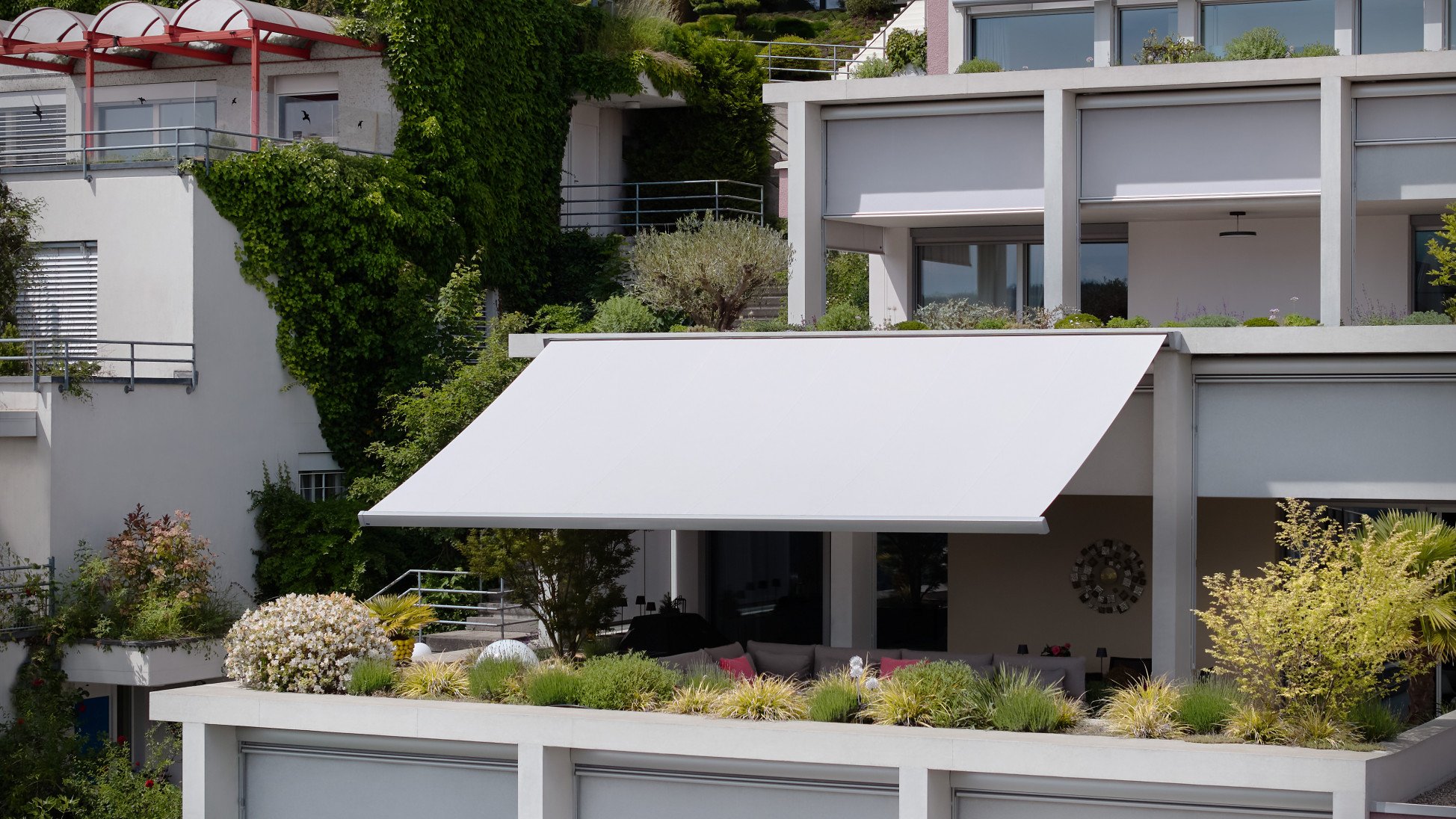La forte pente et la densité du bâti ont posé des défis spéciaux à la logistique, en particulier pour amener les stores sur la terrasse respective. Les stores ont chaque fois été transférés d’un étage au suivant et montés étage par étage. Des stores bannes supplémentaires sont venus s’ajouter plus tard pour ombrager les terrasses et ont été placés avec une précision extrême au moyen de camions-grue.