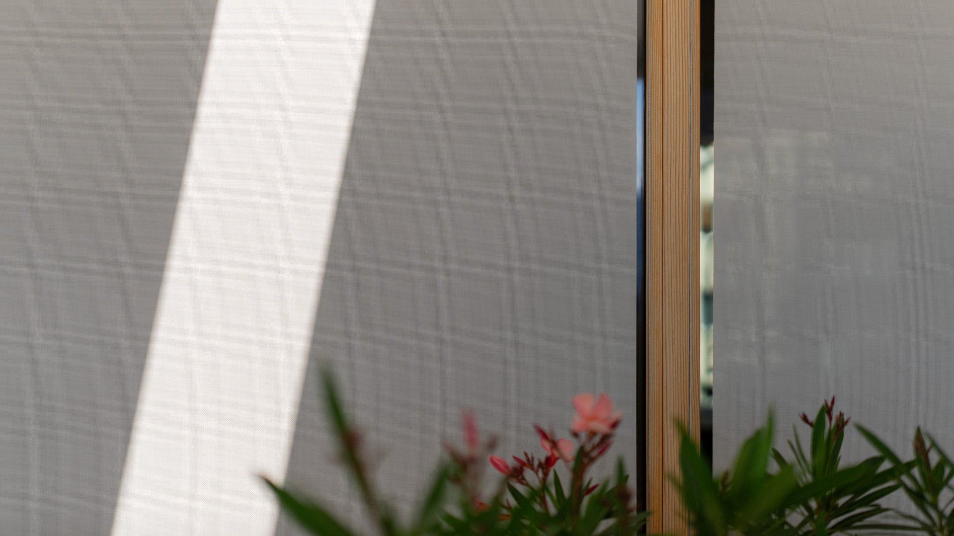 Quand il s'agit de combiner un design exclusif et une solution d’ombrage fonctionnelle, les stores en toile verticaux sont un excellent choix. Ils offrent d’une part des avantages d’ordre esthétique: avec leur design réduit et leur gamme de couleurs disponibles, ils s’intègrent en effet particulièrement bien dans les façades modernes. Une toile brunâtre qui souligne le caractère sensuel de l’édifice en bois a été choisie parmi la multitude de couleurs.