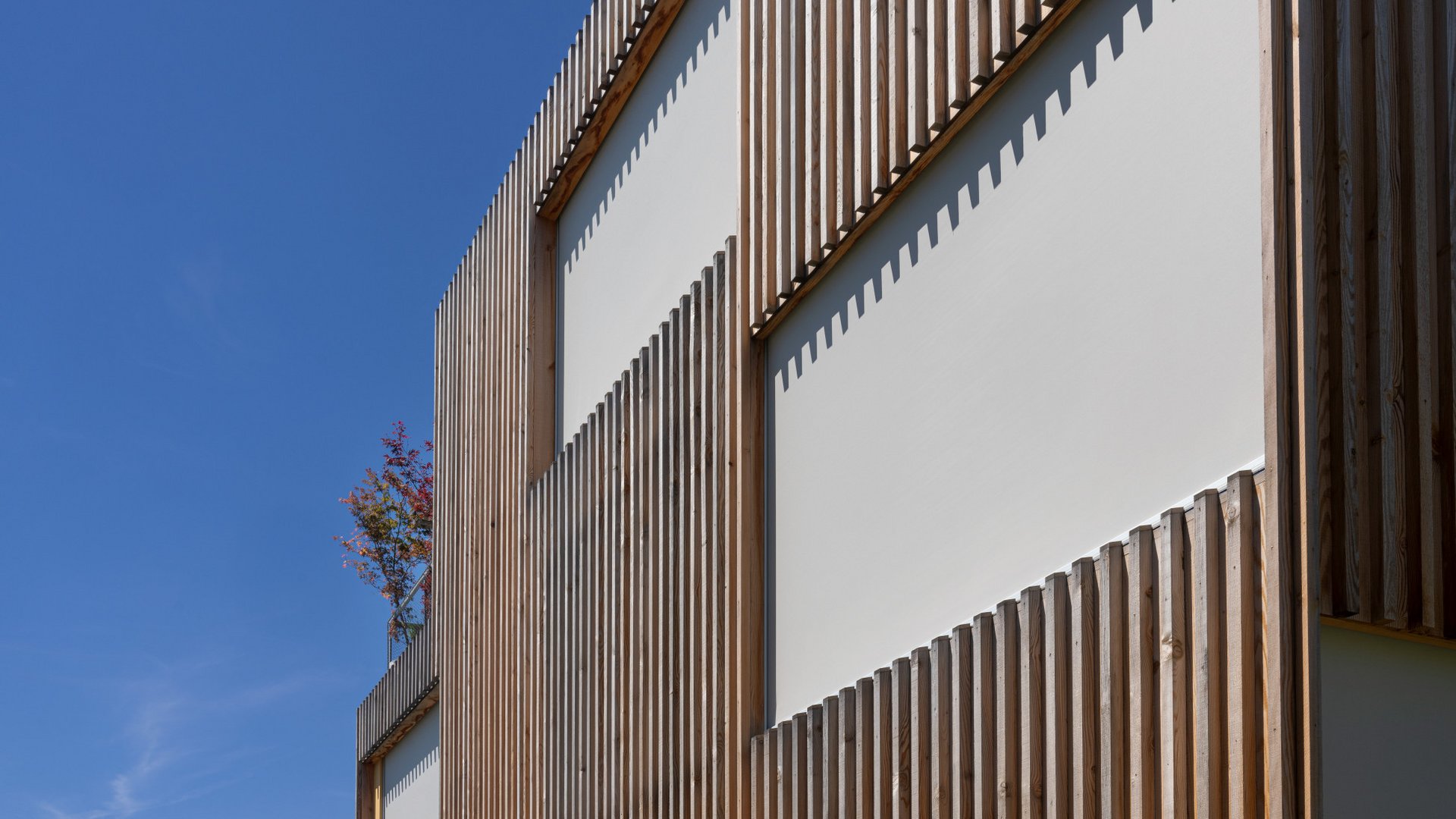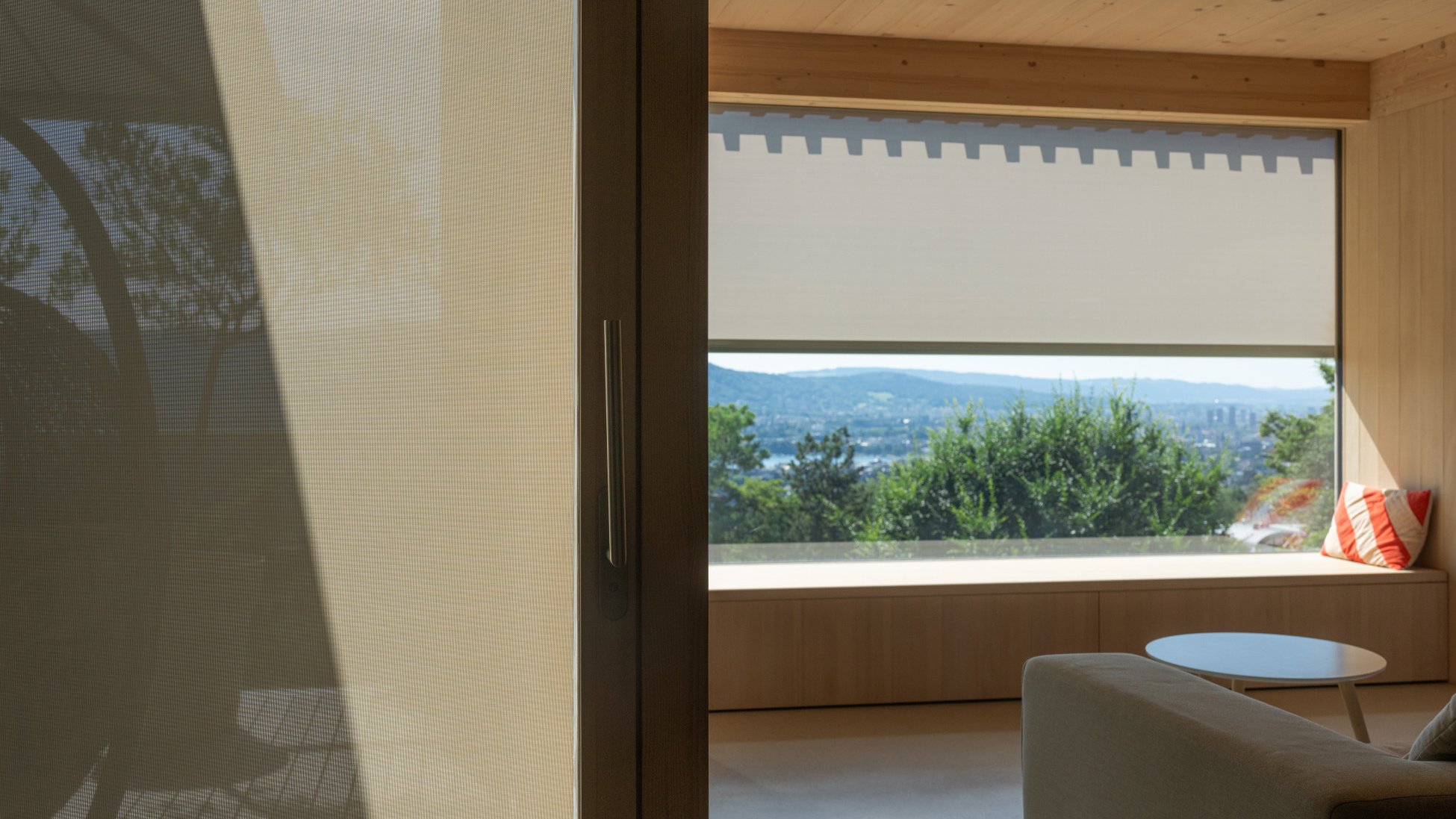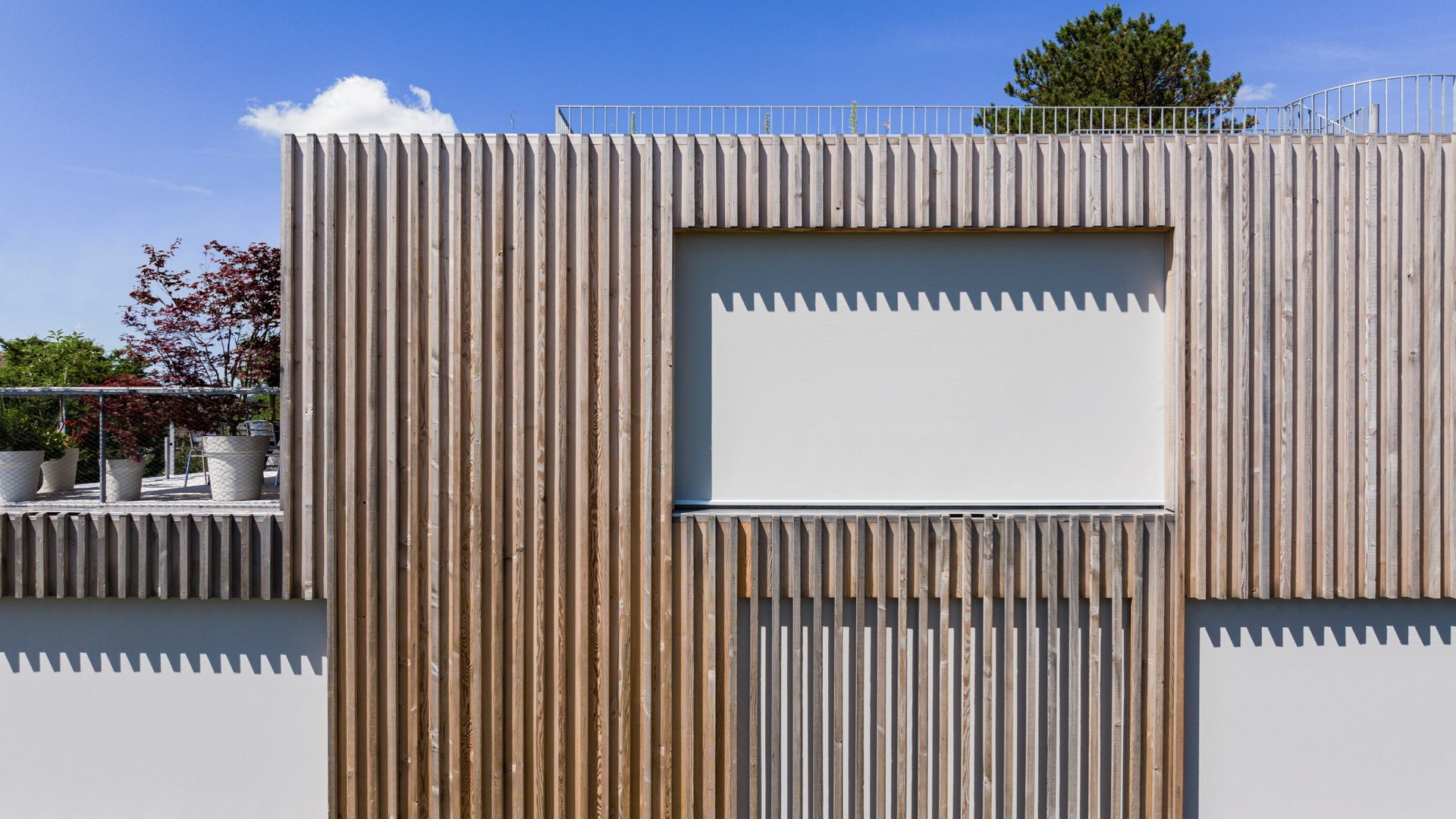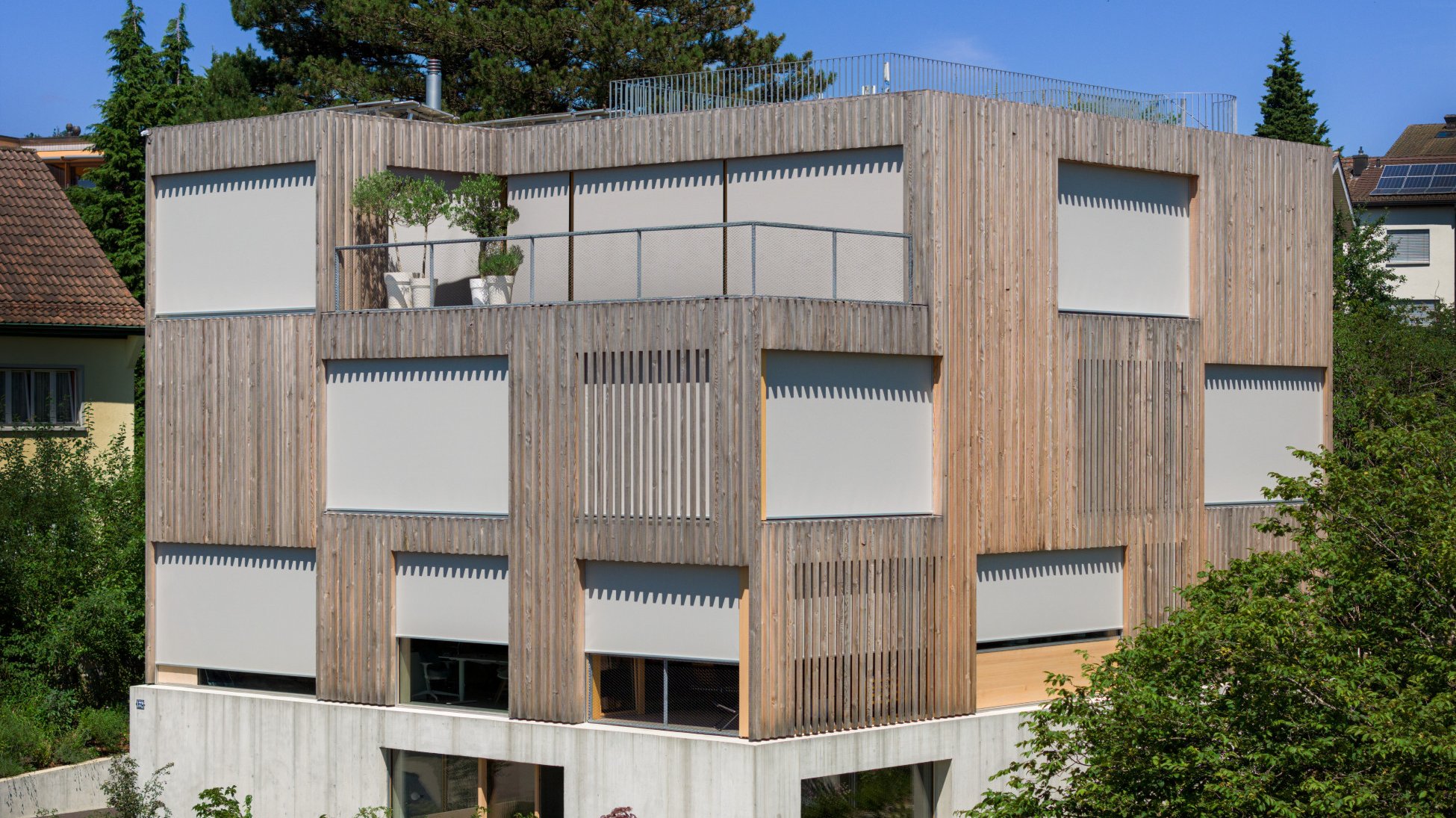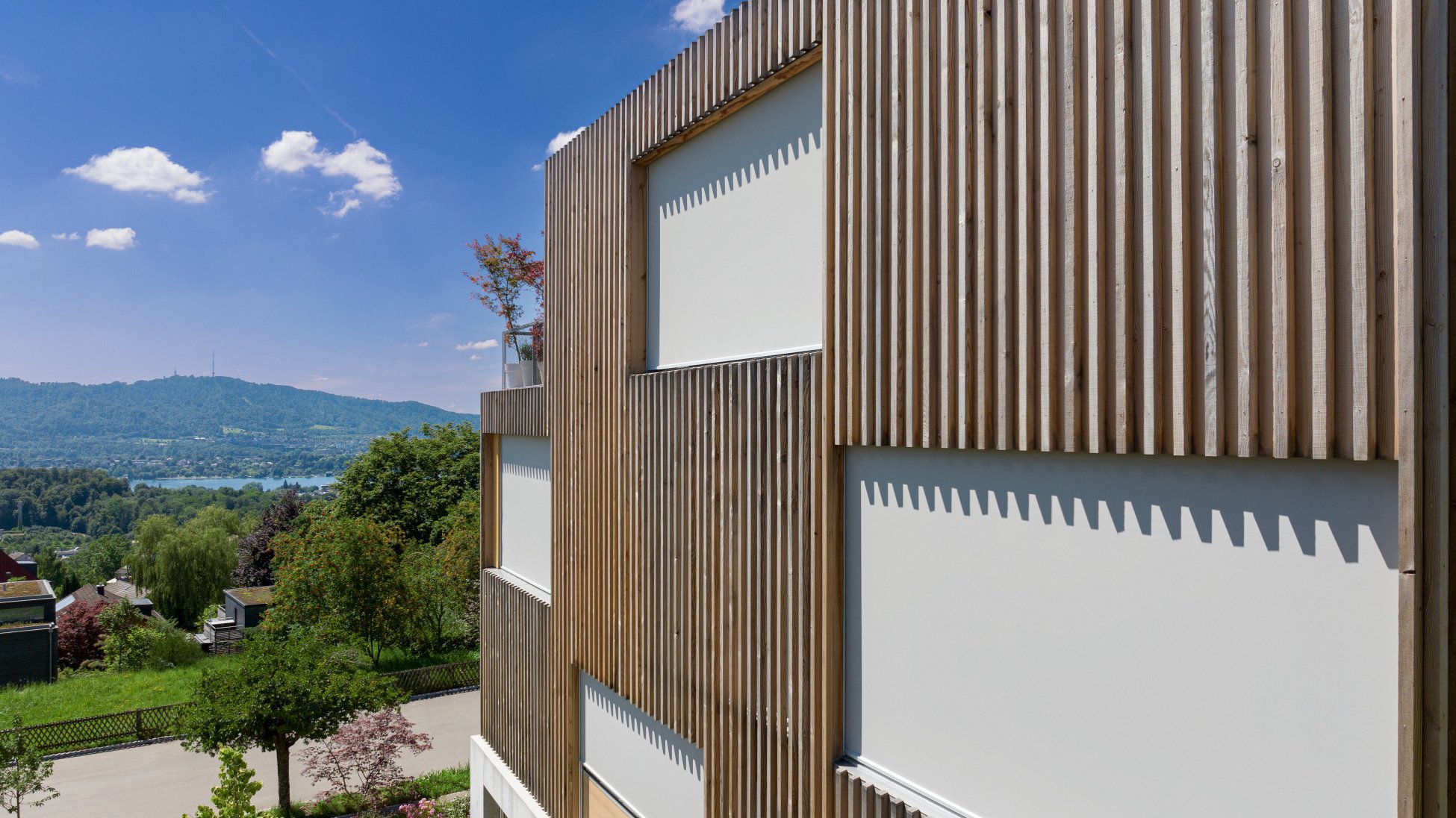 Un édifice spécial qui fait non seulement la part belle à un design exclusif mais aussi à une ambiance naturelle: cet immeuble remarquable dans le quartier zurichois de Witikon est entièrement construit en bois massif et assemblé sans colle ni métal. Seuls le socle et le fût de l’escalier sont en béton. Les murs ont été enduits d’argile pour assurer un climat intérieur aussi sain que possible. La façade habillée de lamelles en bois génère un effet tamisant attrayant; les parois filtrantes aux coins de la loggia créent quant à elles des jeux d’ombre et de lumière supplémentaires. C’est ici qu’intervient Schenker Storen en tant que spécialiste en conception de l’éclairage naturel: en proposant, en guise de solution d’ombrage, des stores en toile verticaux qui renforcent de manière optimale le jeu d’ombre et de lumière et l’atmosphère de bien-être.
