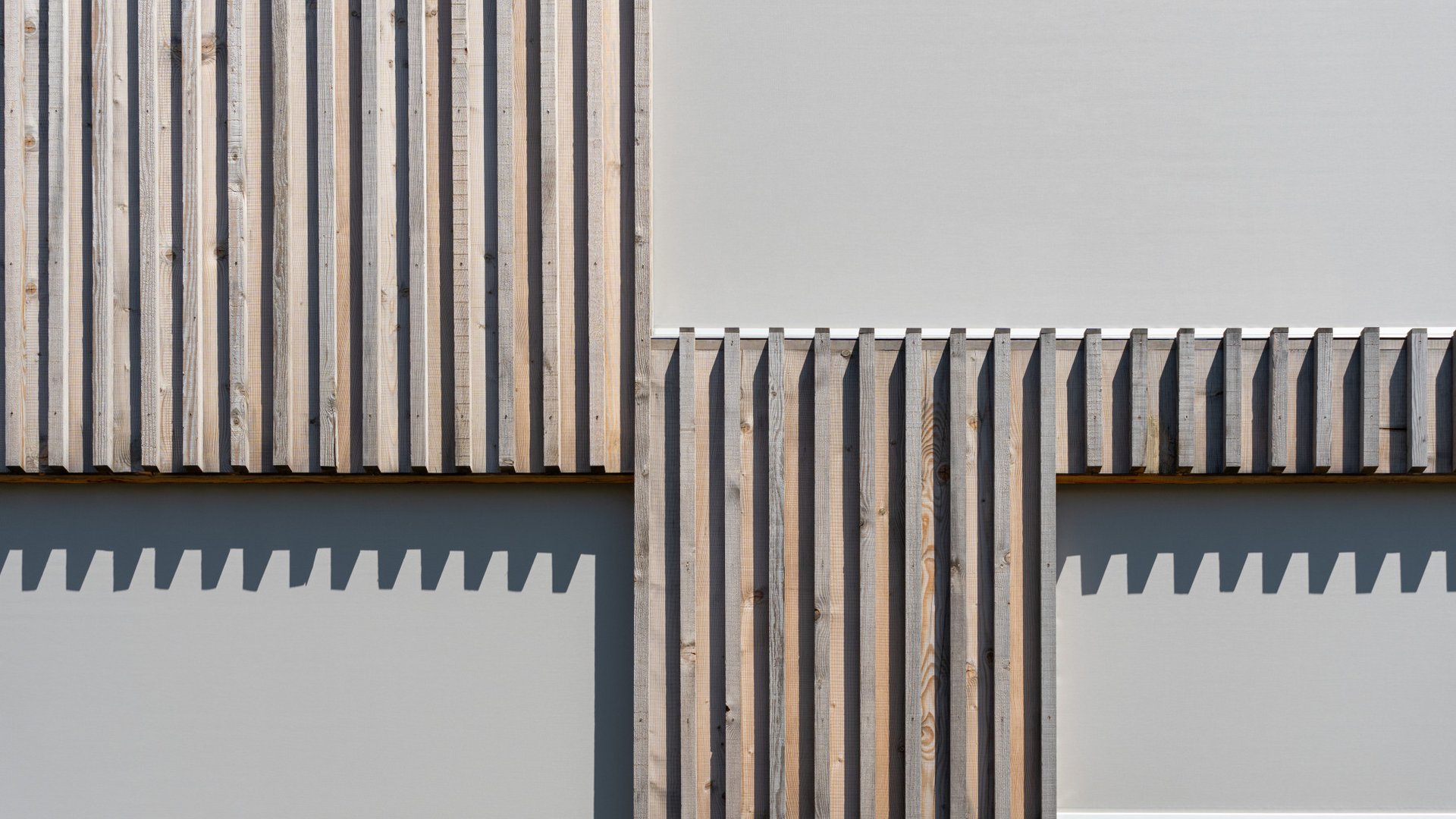 Les 3% restants des rayons lumineux suffisent pour atteindre une légère transparence – et inonder ainsi les espaces intérieurs d’une dose agréable de lumière naturelle sans obstruer la vue vers l'extérieur. Cet effet est rendu possible par l’utilisation de fibres de verre obtenues à partir de verre en fusion étiré en filaments qui sont ensuite tissés. Les toiles protègent ainsi contre l’éblouissement, les regards indiscrets et la chaleur, mais elles contribuent aussi à l’éclairage et donc à l’atmosphère de la pièce. La couleur brunâtre retenue pour les stores en toile est assortie à la teinte chaleureuse de l’édifice en bois non seulement à l’extérieur sur la façade mais aussi à l’intérieur où elle crée des effets lumineux.