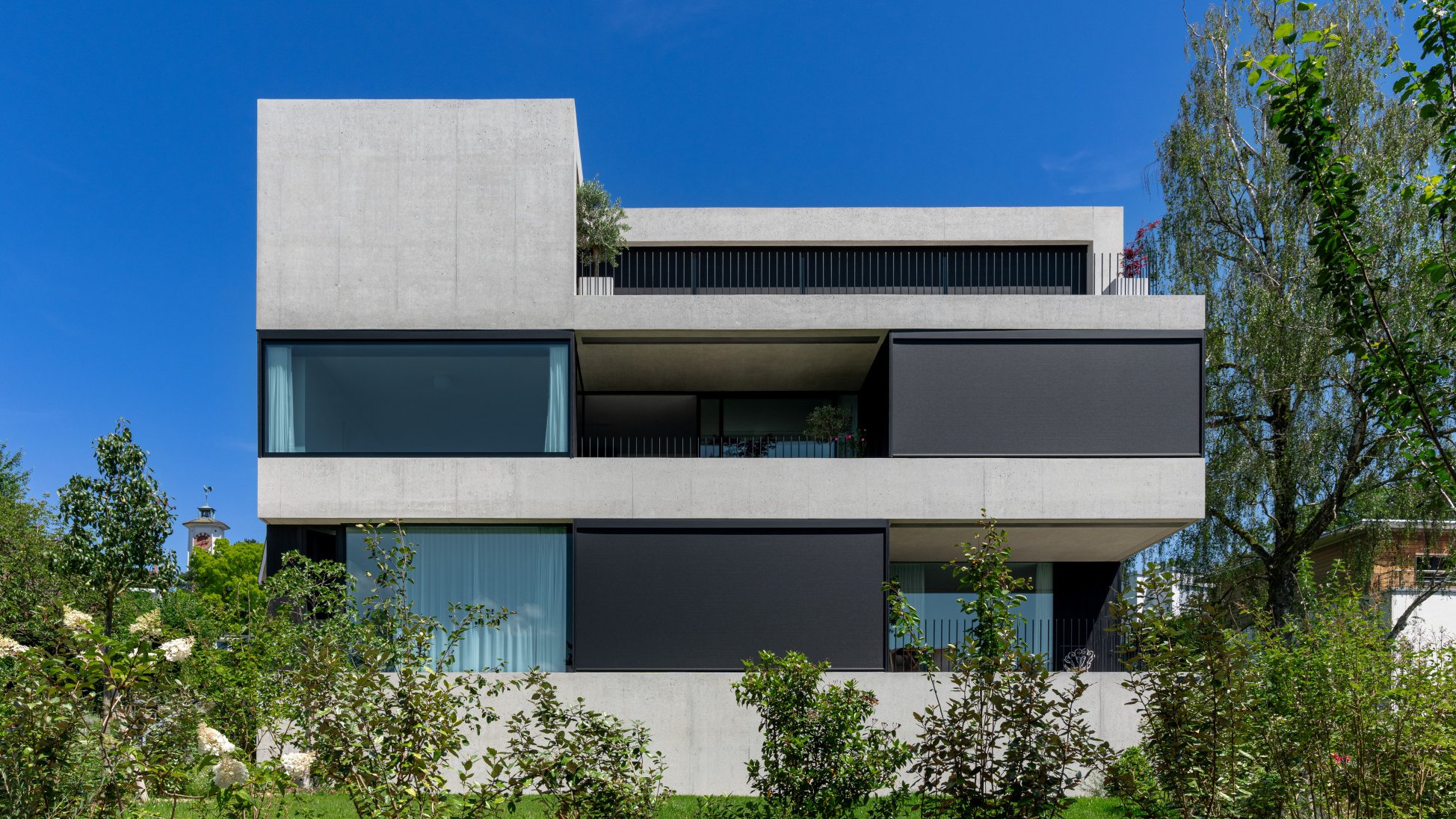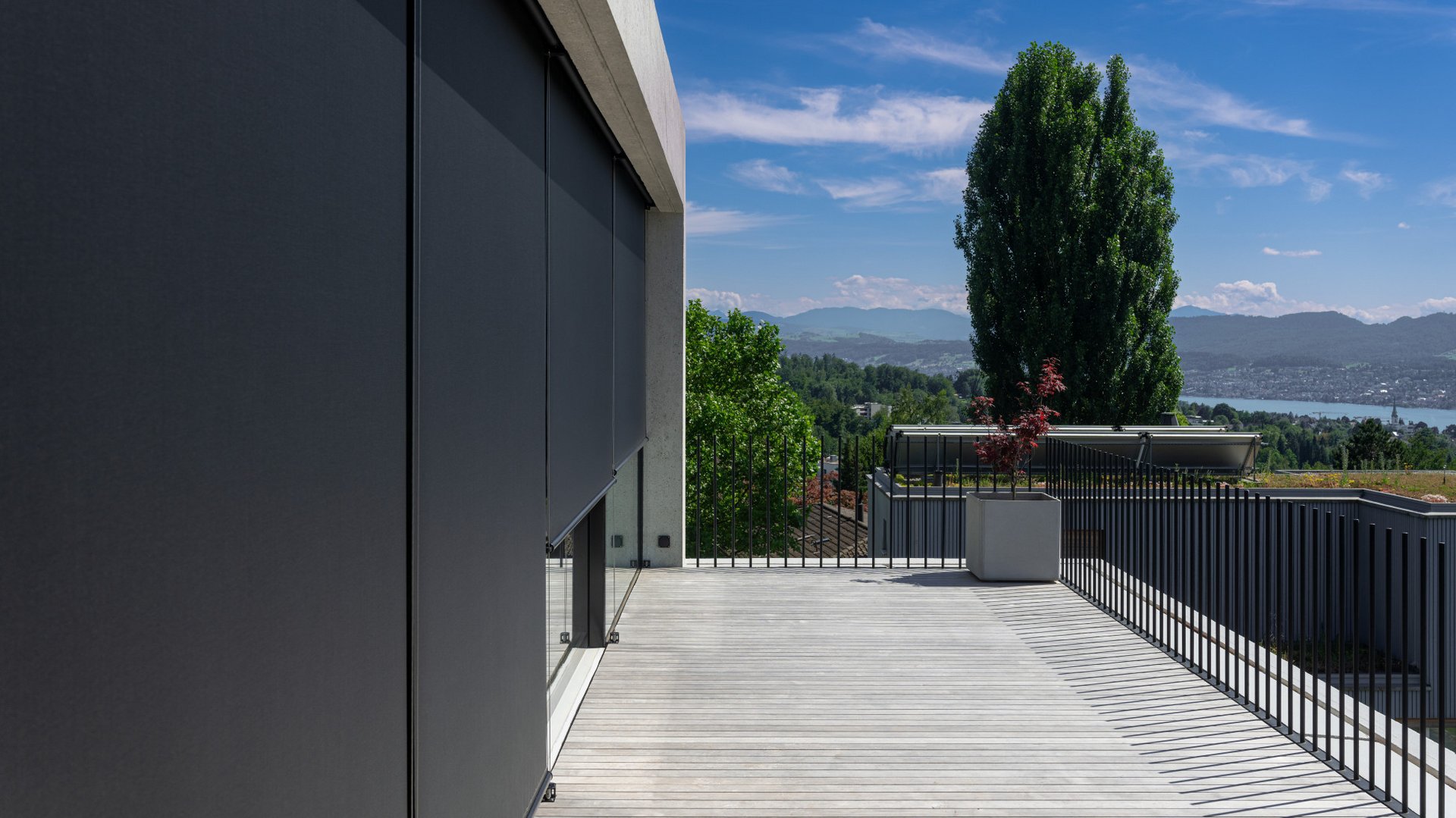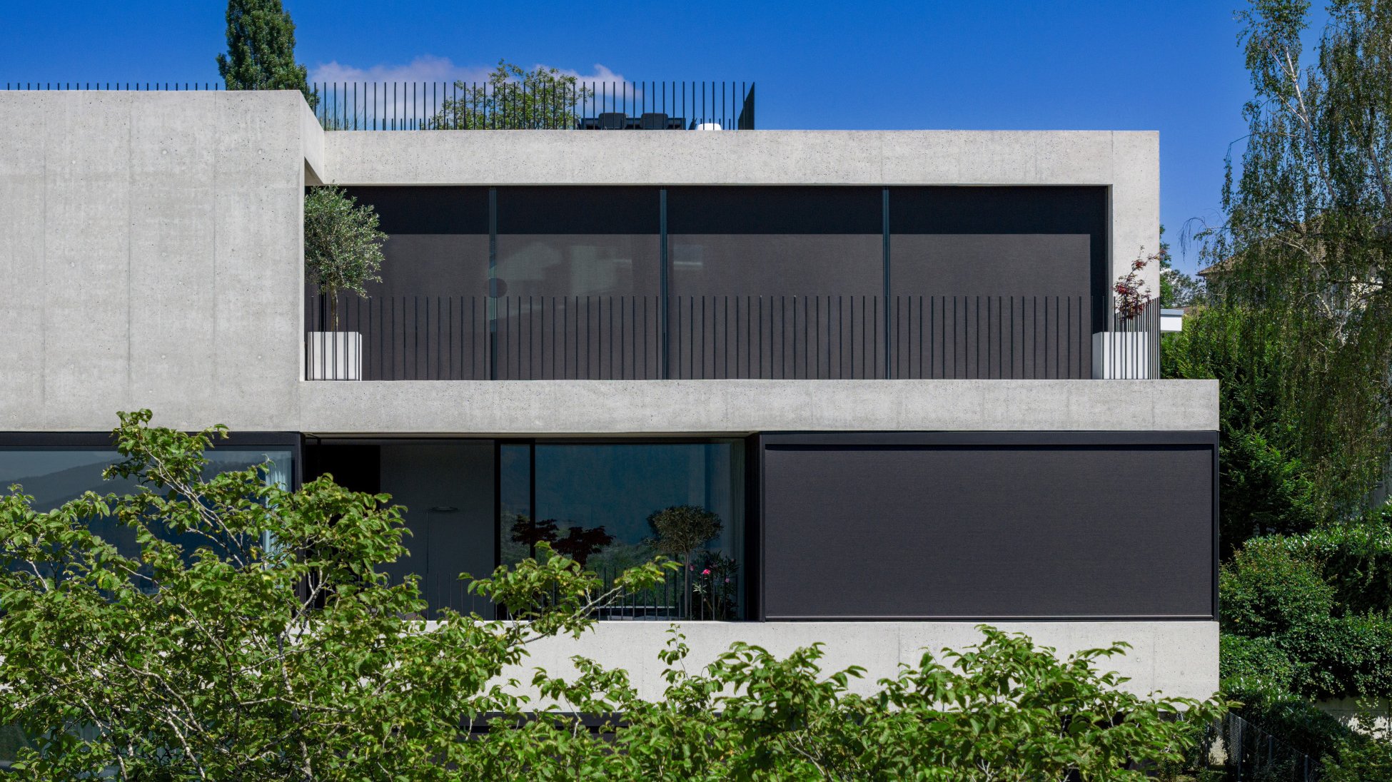 Un regard suffit pour se convaincre qu’il ne s’agit pas d’un immeuble ordinaire. L’édifice en béton au look futuriste séduit par son design épuré et ses lignes claires. Le bâtiment fait partie d’un ensemble de deux constructions neuves habitées par une famille avec différents propriétaires. De grandes façades vitrées offrent aux habitants, ici dans le quartier de Zurich-Witikon, une vue splendide sur le lac de Zurich et les Alpes. Schenker Storen a été chargée de réaliser pour ces façades vitrées une solution d’ombrage répondant aux exigences élevées des architectes en matière de design.