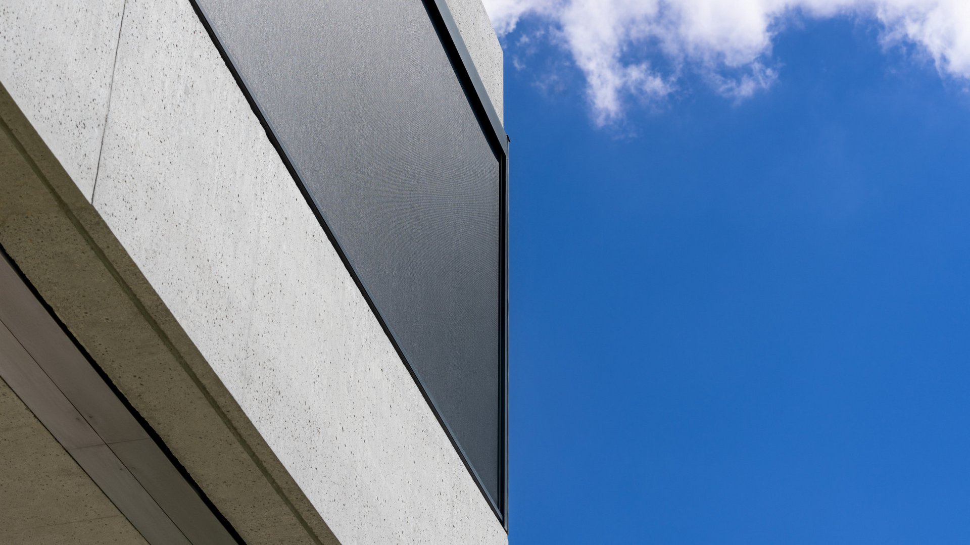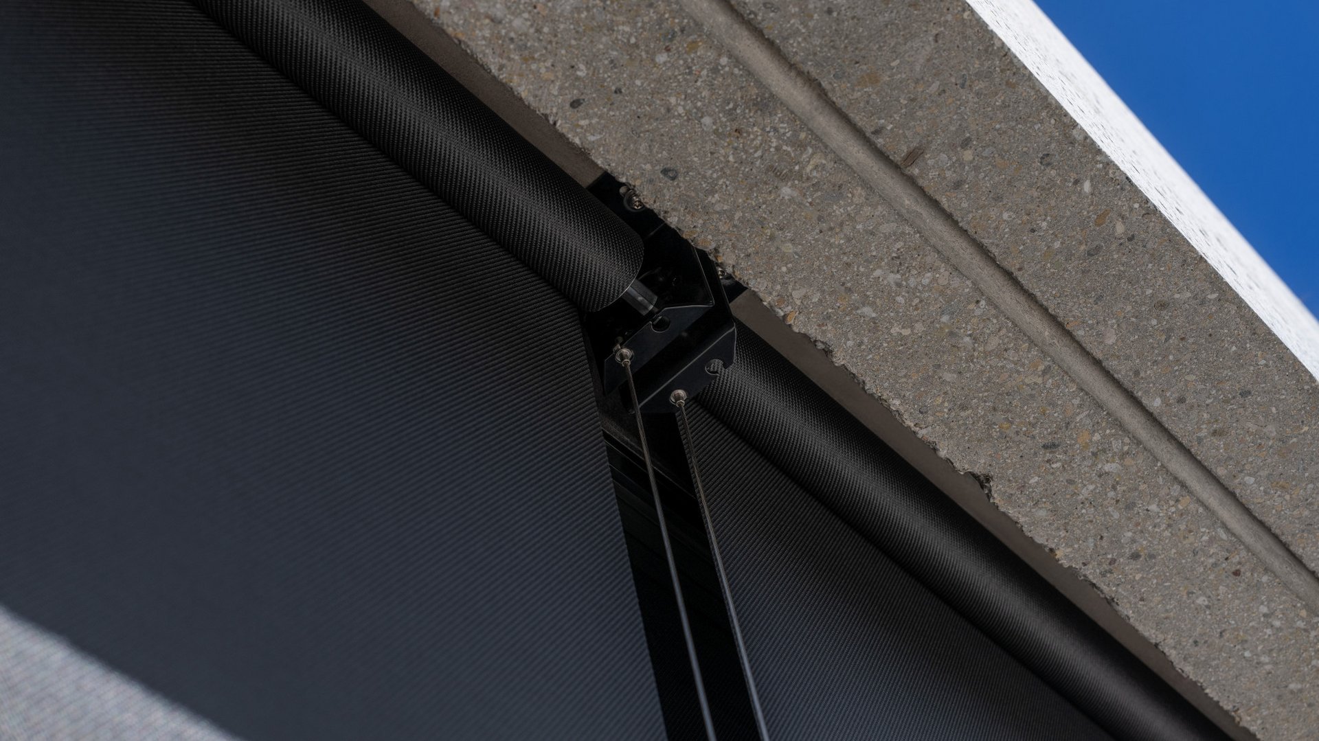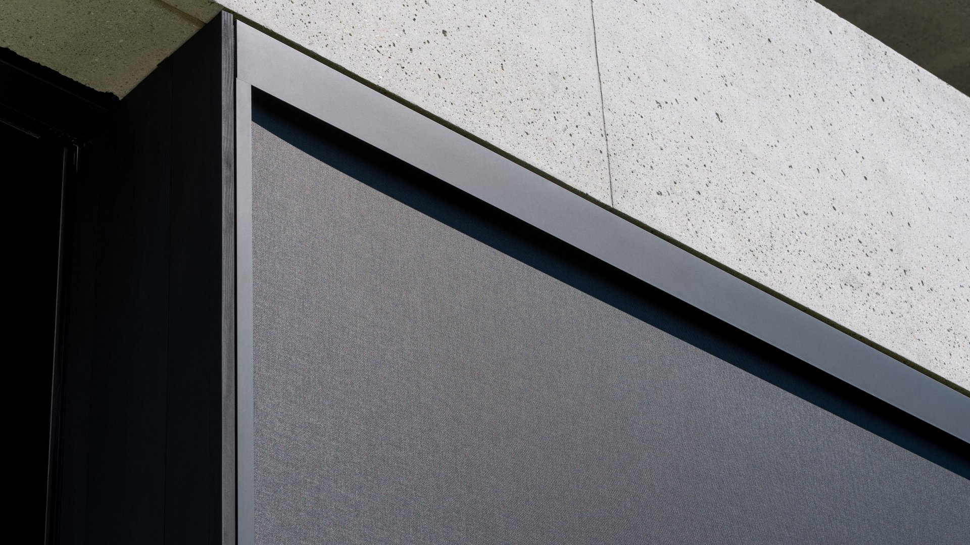 Les stores en toile verticaux sont un choix particulièrement populaire dans les maisons individuelles et les immeubles modernes au design exceptionnel parce que leurs nombreuses variantes permettent une grande flexibilité et qu’ils s’intègrent discrètement dans la façade. Des toiles noires assorties aux cadres des fenêtres et aux grandes surfaces de façade noires ont été choisies dans ce cas-ci. La particularité de la toile choisie est qu’elle est composée de fibres de verre obtenues à partir de verre en fusion étiré en filaments qui sont ensuite tissés. Ce procédé permet d’obtenir une légère transparence – avec les caractéristiques et les possibilités de jouer avec l’ombre et la lumière que cela entraîne.