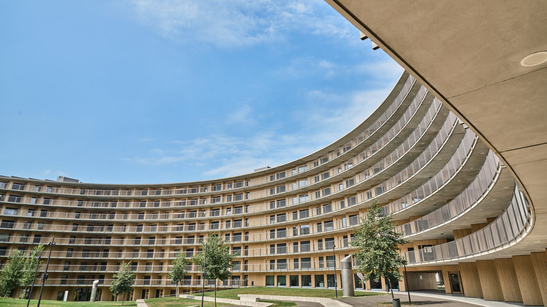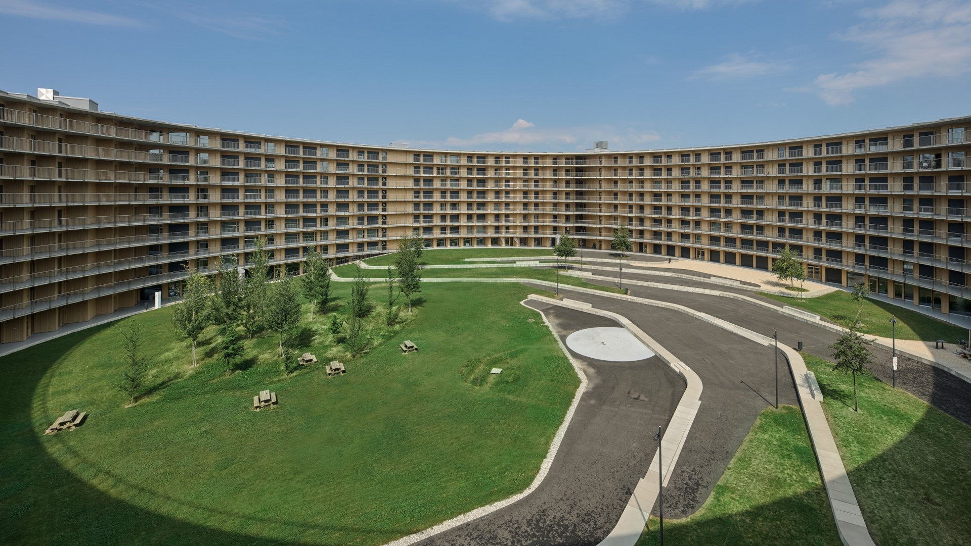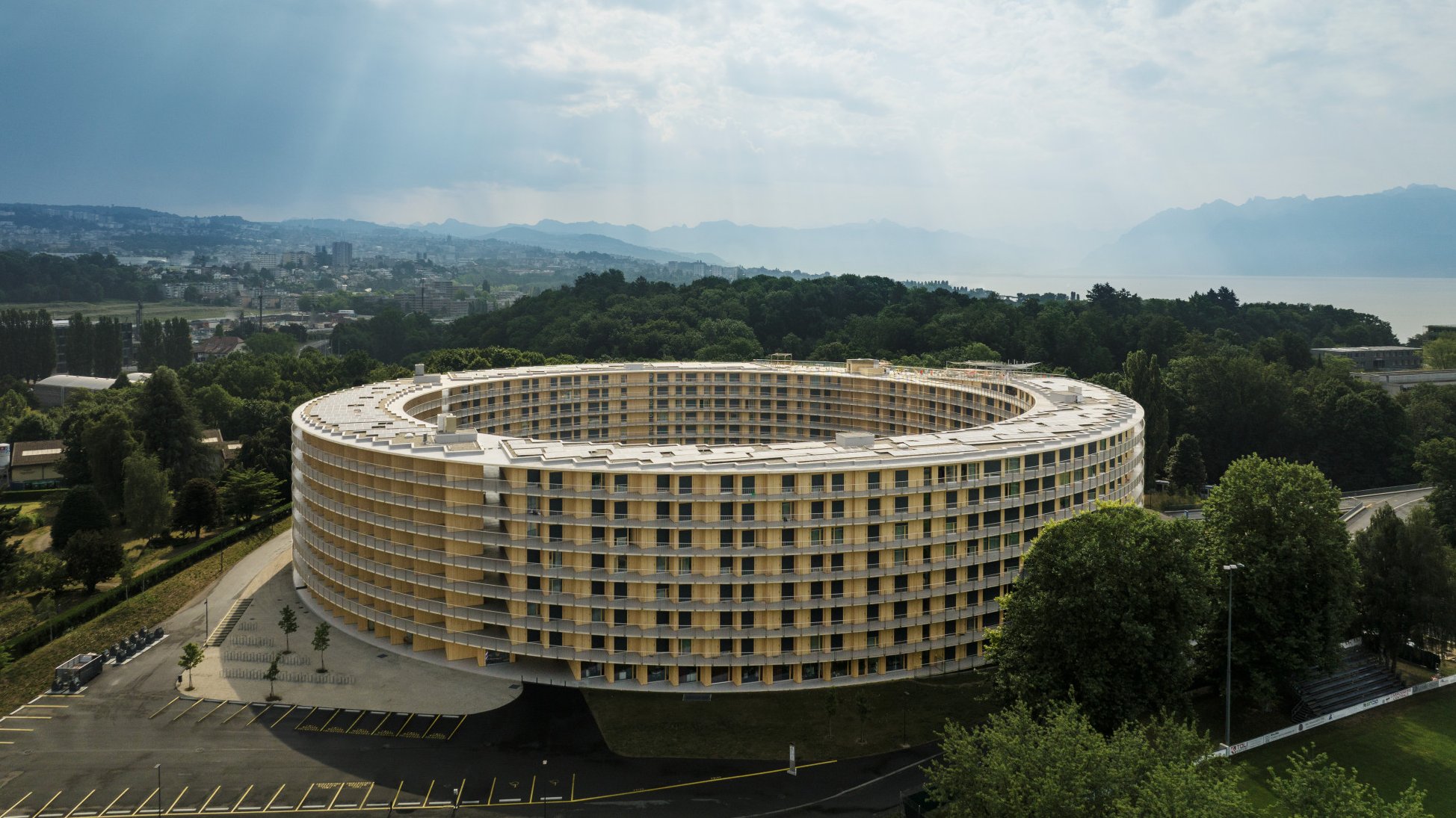900 jours pour 900 appartements: le calendrier de planification et de construction de la cité universitaire Vortex à Chavannes-près-Renens était sportif et n’a pu être réalisé que grâce à l’utilisation de la méthode BIM. Mais, en fin de compte, le bâtiment devait être terminé à temps pour les Jeux Olympiques de la Jeunesse qui se sont tenus à Lausanne et dans ses environs durant l’hiver 2019/20. Le bâtiment circulaire de 10 étages est situé à la périphérie du campus de l’Université de Lausanne à Chavannes-près-Renens. La particularité de ce bâtiment cylindrique est la rampe en forme de spirale d'une longueur de 2,8 km qui relie les étages et permet l’accès à tous les appartements du complexe. Elle affiche une côte inférieure à un pour cent et présente également des composantes sociales. En sa qualité de «voie commune» pour ainsi dire, elle favorise le sentiment d’appartenance, la communication et l’échange entre les résidentes et les résidents. Les panneaux photovoltaïques installés sur le toit couvrent une partie de la consommation en électricité du Vortex. En outre, des pompes à chaleur vont chercher l’eau du lac Léman à 60m de profondeur pour alimenter la centrale de chauffage avec une eau à température constante de sept degrés Celsius.