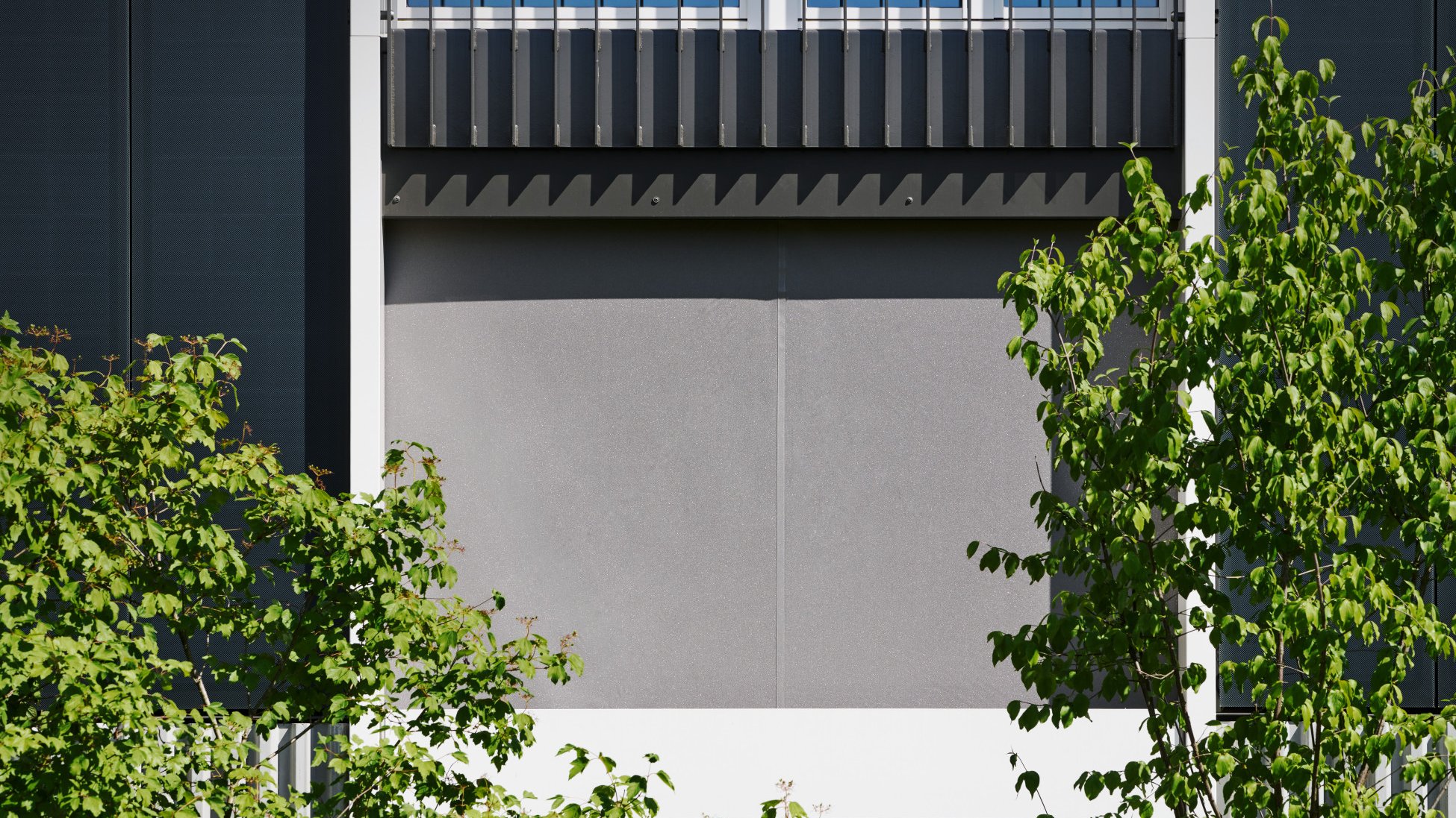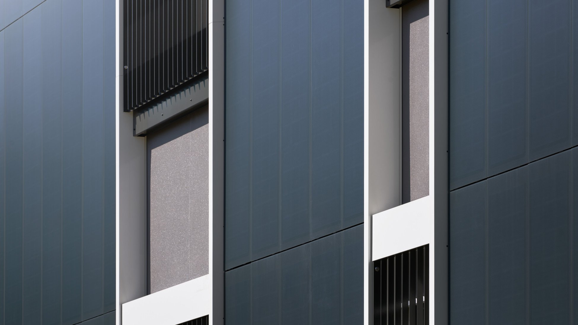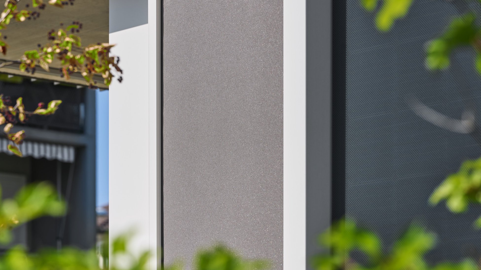 Les embrasures des façades ventilées par l’arrière sont encadrées d’élégantes huisseries métalliques, une preuve que le maître d’ouvrage a accordé une grande importance aux détails lors de la réalisation du projet. Les rails de guidage du VSeZip sont encastrés dans ces huisseries, à peine visibles à l'œil nu. Si le store en toile vertical n’est pas utilisé, il disparaît dans le coffre au moyen d’un actionnement électrique. La couleur du coffre est assortie au store et forme un tout harmonieux avec la teinte de l’huisserie métallique, de la toile et de la façade.