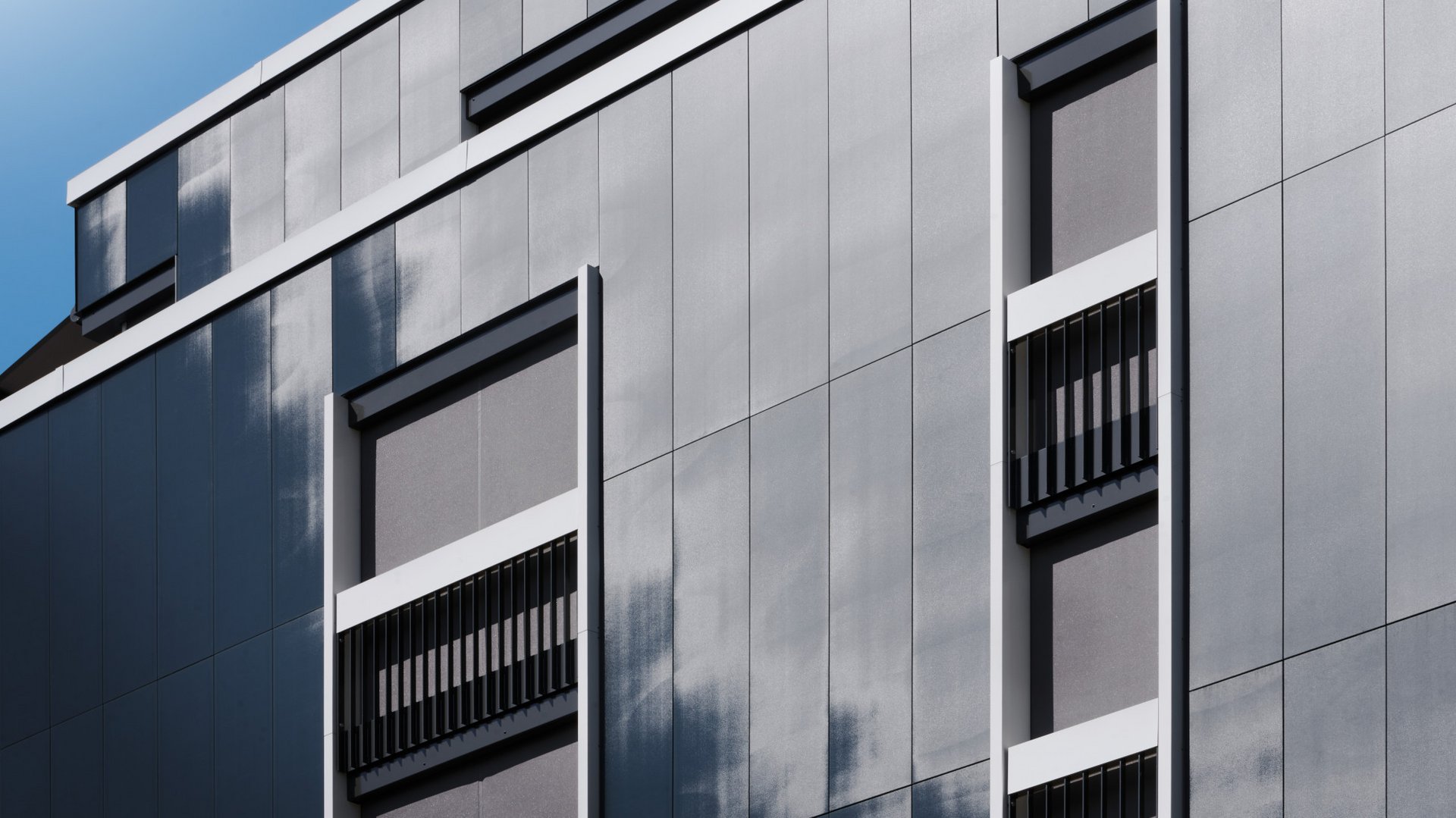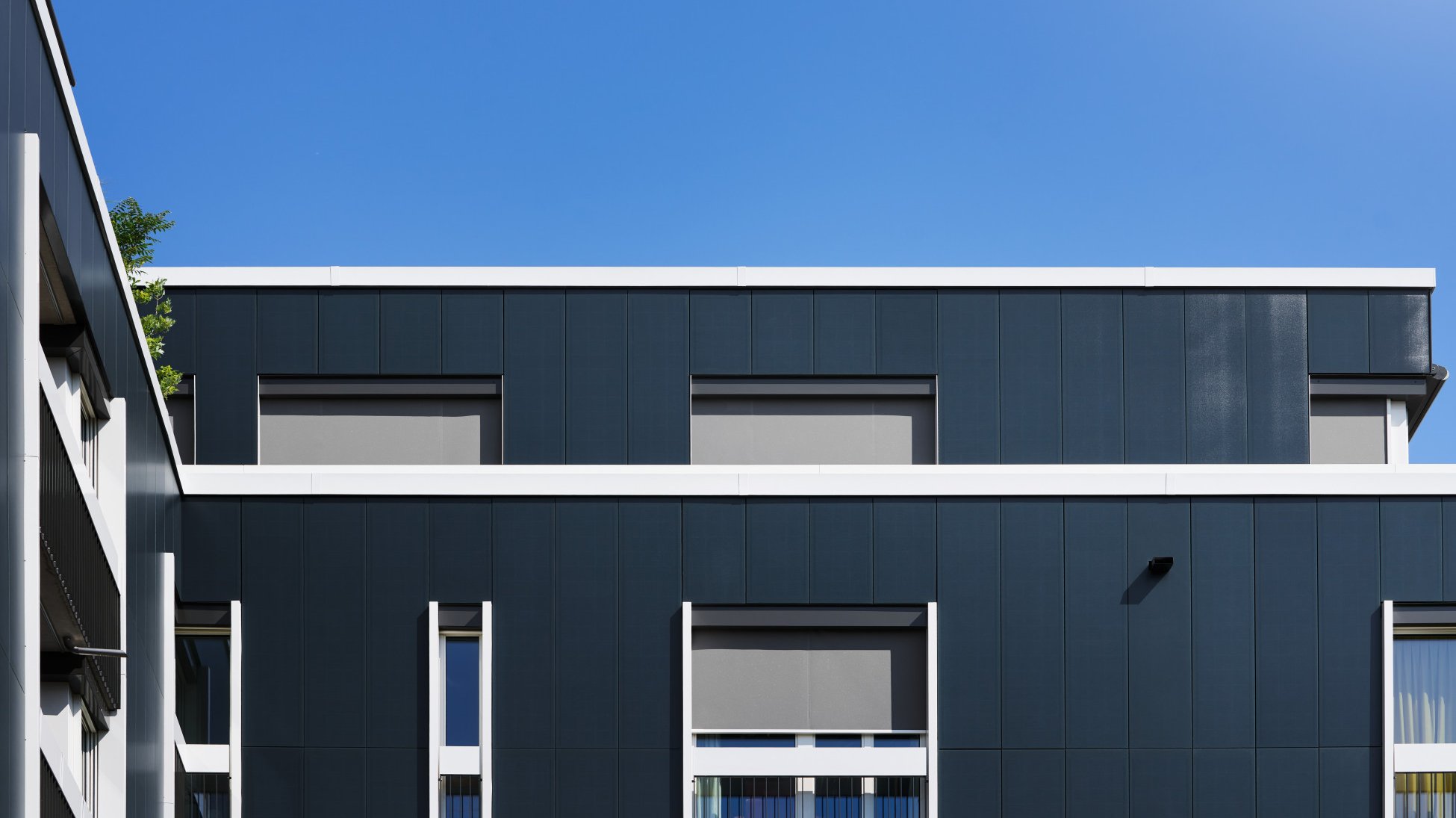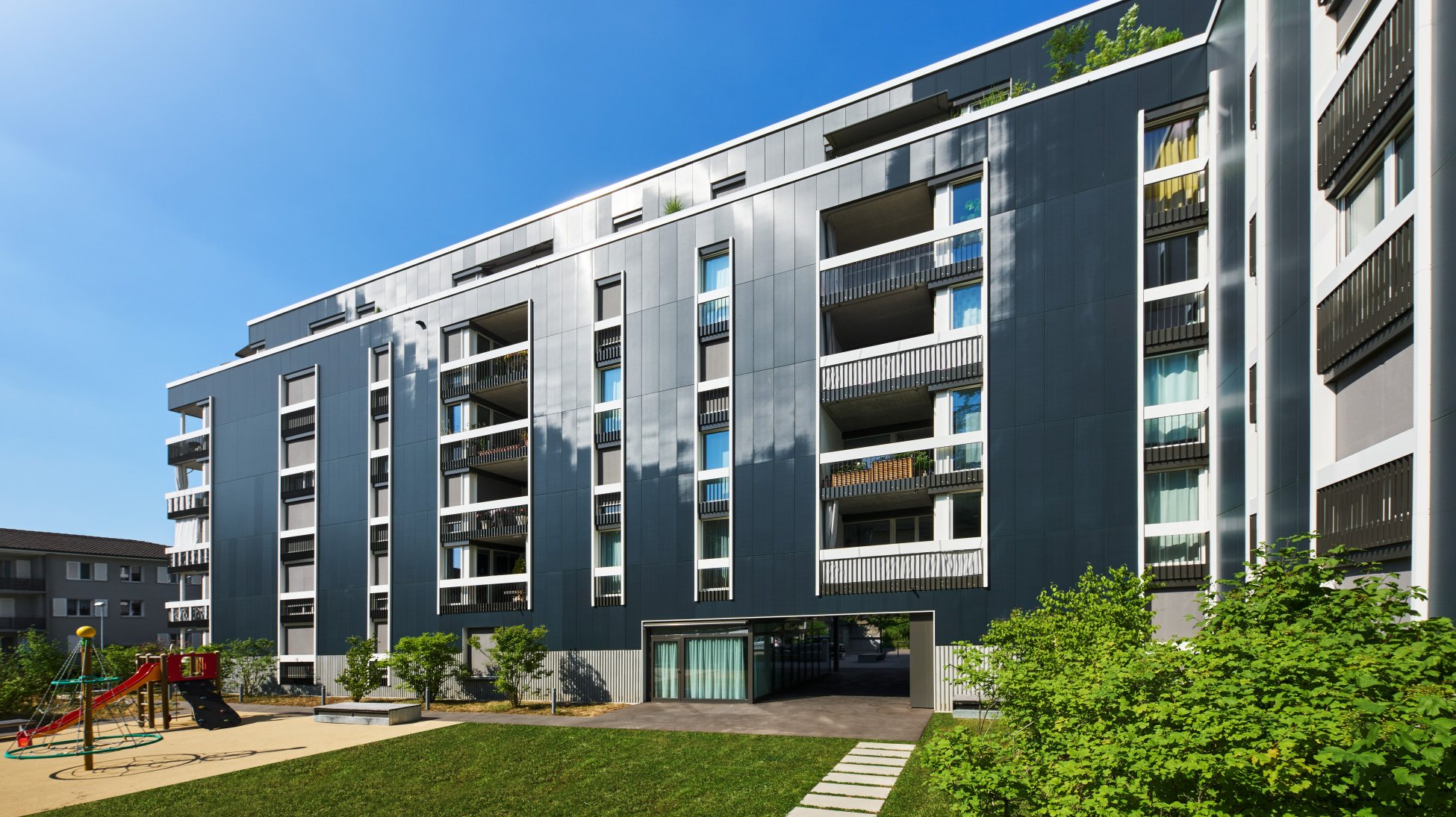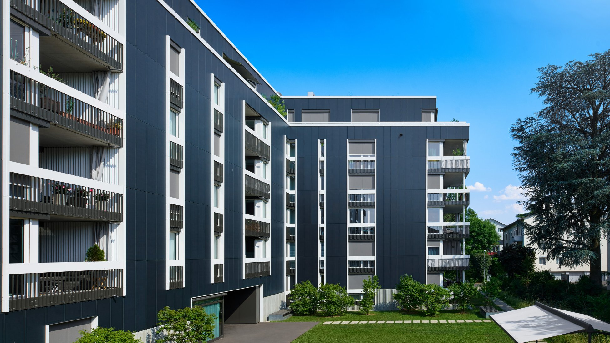 Les deux bâtiments neufs «Im Heuwinkel» à Allschwil devaient être «discrets et peu gourmands en énergie». C’était ce que souhaitait la propriétaire, la coopération de construction et d’habitation Graphis. Les immeubles, terminés en 2021, sont discrets et pourtant, on les remarque, surtout quand on s’en approche: leurs façades sont entièrement recouvertes de panneaux solaires. Cela représente une surface totale de 2500m2, ce qui constitue une nouveauté dans la construction résidentielle en Suisse. Les enveloppes des bâtiments sont seulement interrompues par des ouvertures de balcons et des bandes de fenêtres verticales. Avec leur orientation longitudinale et leurs largeurs différentes, d’étroite à généreuse, ces dernières rythment les surfaces bleu foncé des panneaux solaires.