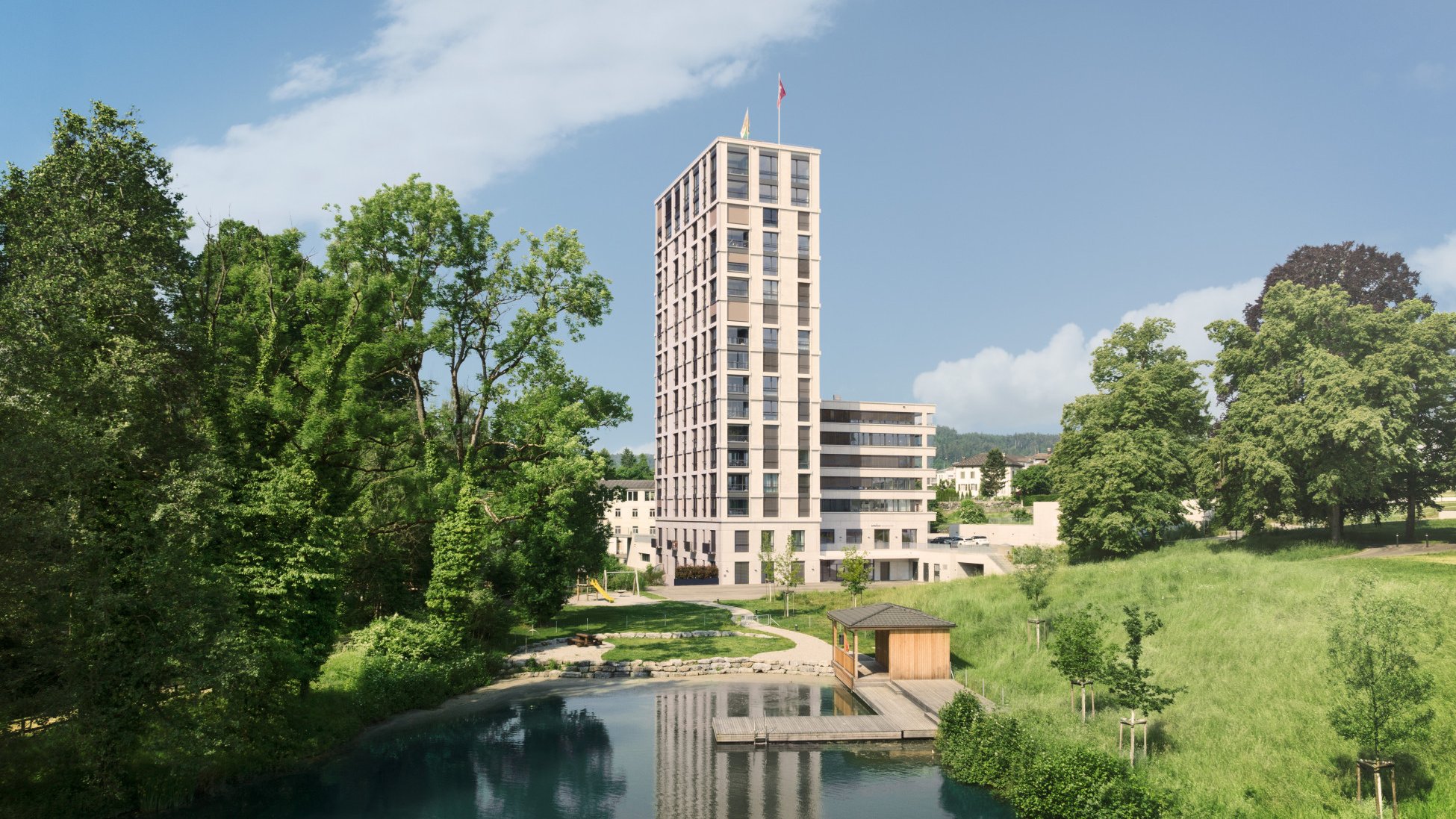Une tour résidentielle s’élève depuis le 1er août 2021 là où une roue de moulin tournait depuis 1288 et où se dressait il y a encore deux ans le moulin Eberle. Elle abrite 44 appartements haut de gamme de 2,5 à 4,5 pièces avec des fenêtres sur toute la hauteur et des lofts ont été aménagés dans la salle des machines en annexe. L’offre sur le terrain de 60 000m2 est complétée par un étang de baignade et une terrasse de toit réservés aux locataires.