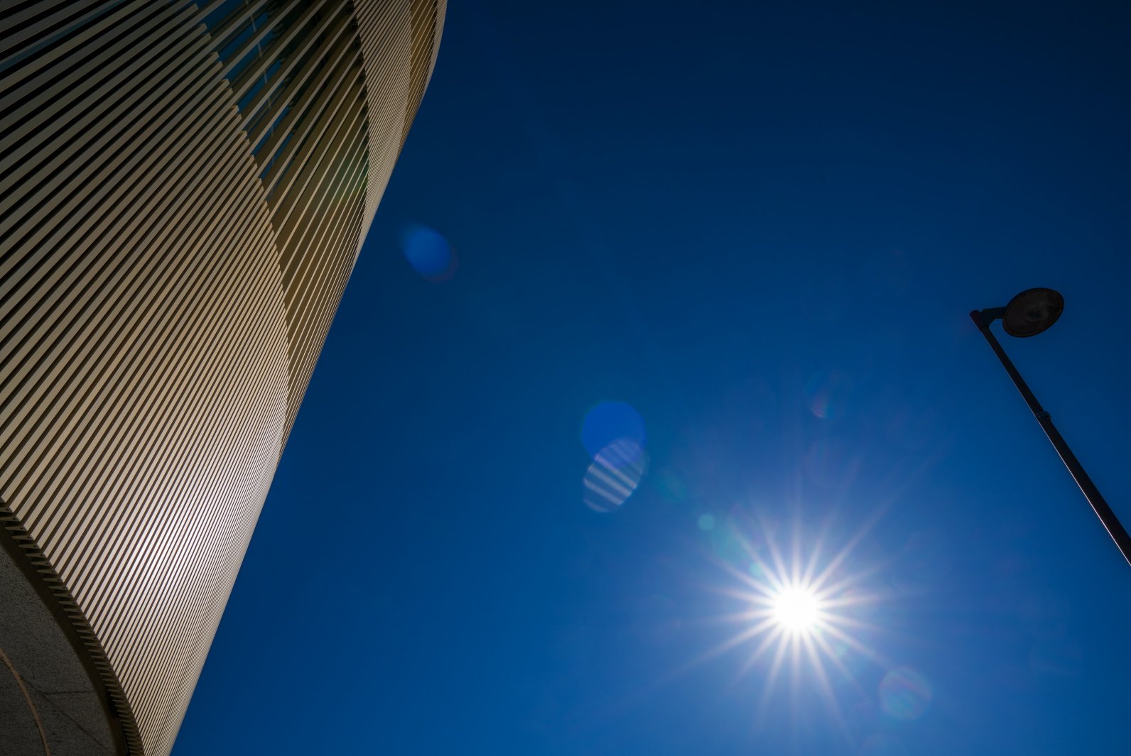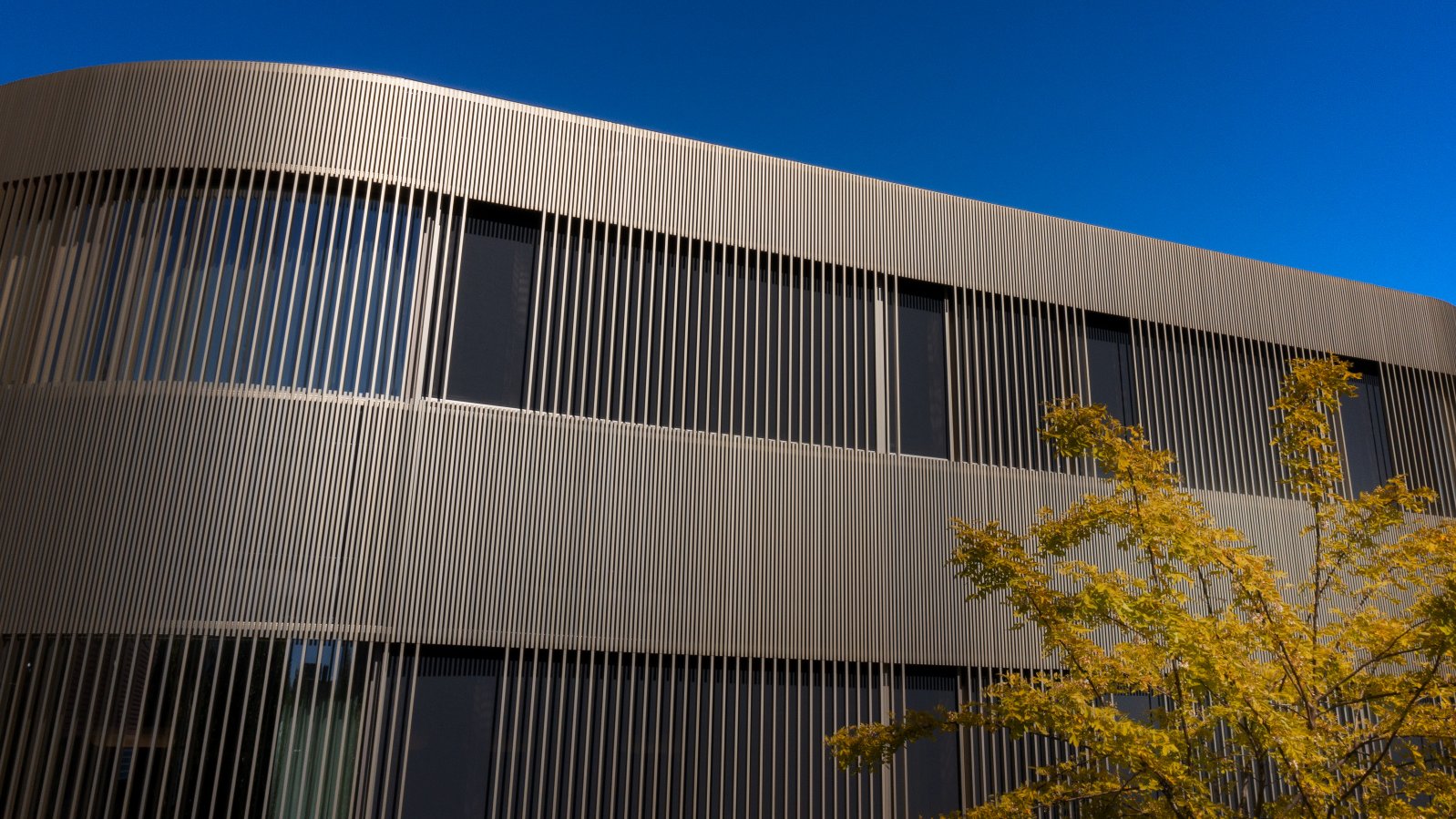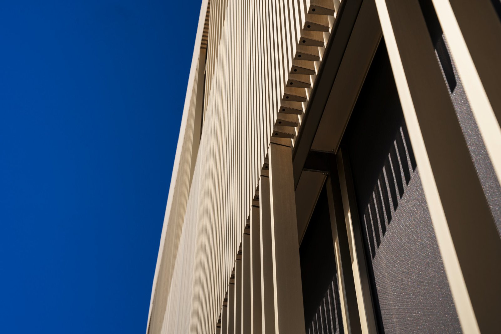 La façade extraordinaire de 310 mètres carrés se pose sur l’édifice comme un ruban. Elle comprend des fins profilés en aluminium verticaux. Pour que l’habillage de la façade puisse être réalisé correctement et pour que toutes les faces visibles des lattes fassent état du même écartement les unes par rapport aux autres, il a d’abord fallu monter la sous-construction avant que les éléments puissent être produits à la largeur adaptée avec les profilés en aluminium. C’est pourquoi nous avons dû mesurer les installations destinées aux stores en toile verticaux résistants au vent intégrés en étroite collaboration avec le constructeur de la façade et avec le chef de chantier lorsque la façade était à moitié terminée et les poser en juste-à-temps avec le constructeur de la façade. Ce n’est qu’ensuite que la façade a pu être achevée. La couleur des caissons, des coulisses et des barres à toile est rigoureusement identique à celle de la façade pour que la protection contre le soleil s’intègre harmonieusement à l’apparence générale du bâtiment. La toile sélectionné en anthracite fait ressortir l’édifice qui ressemble à un bronze. Pour que la relation avec le monde extérieur assurée par la protection contre le soleil ne soit pas perdue, nous avons choisi une toile offrant à la fois une transparence incomparable et une pénétration de lumière naturelle agrémentée d’un excellent niveau de confort pour les utilisateurs grâce à la transparence du Soltis 86.