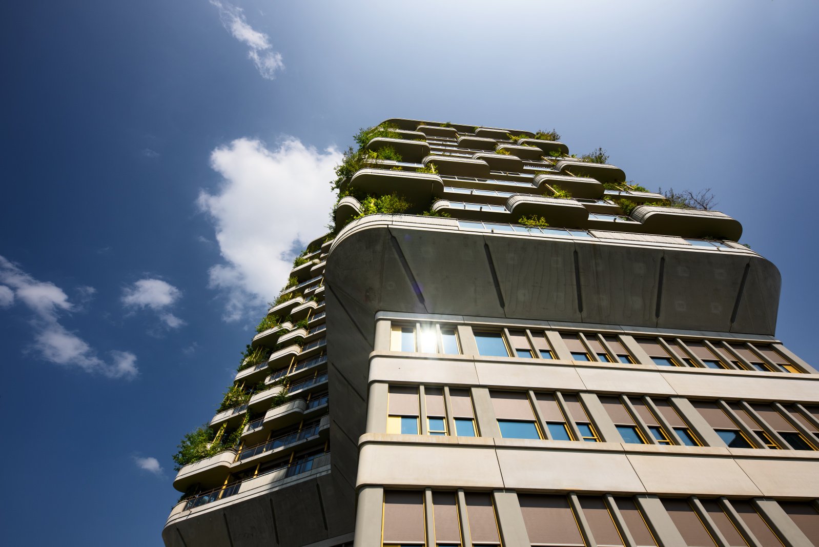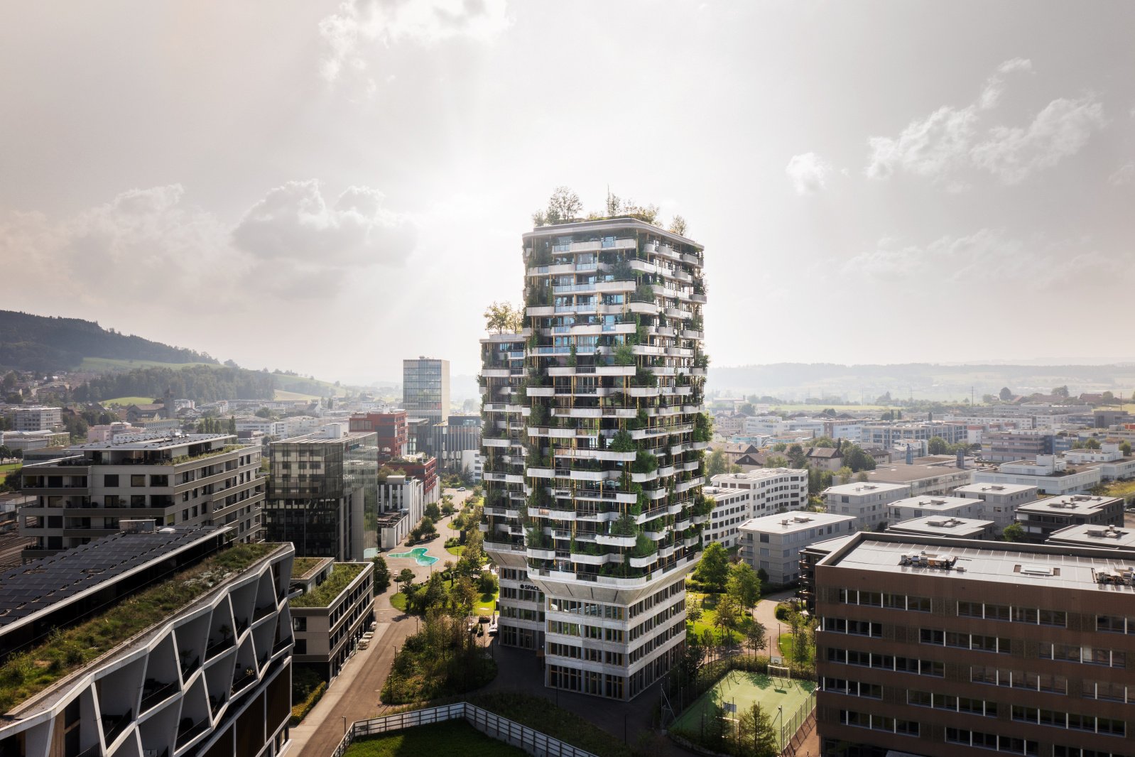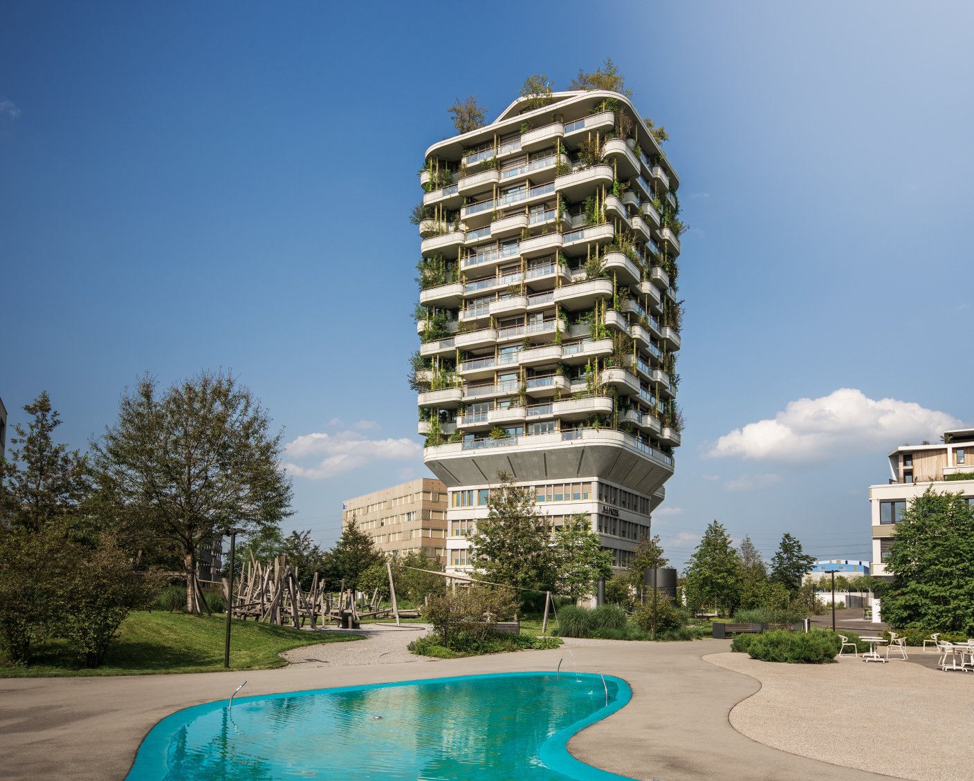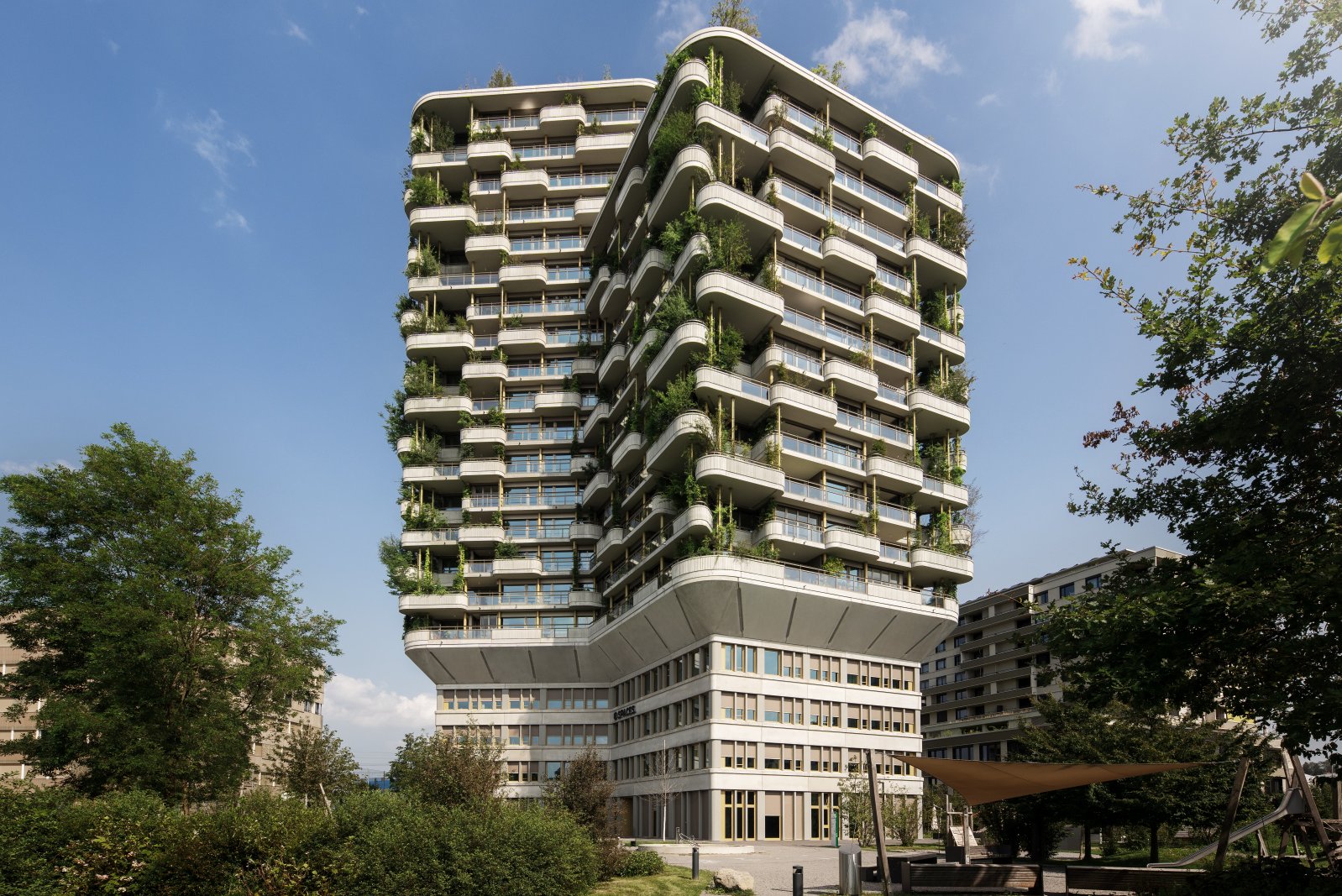 La forme de cette tour végétalisée neutre en CO2 est unique en Suisse. Son plan se fonde sur un huit anguleux doté de six coins extérieurs. Chacun des 85 appartements dispose ainsi de sa propre position en coin et d’une vue de l’extérieur dans deux directions différentes. Des jardins verticaux et beaucoup de verre créent une transition harmonieuse entre l’intérieur et l’extérieur. Grâce au concept de végétalisation sophistiqué, tous les appartements disposent d’un balcon végétalisé exubérant et d’une terrasse de toit assortie de bosquets solitaires, de plantes grimpantes et de plantes vivaces qui confèrent à l’édifice des habits colorés en fonction de la saison. Les concepteurs ont délibérément choisi des plantes qui prodiguent de la variété au bâtiment selon la saison. Tandis qu’un épais manteau de feuillage ombrage les appartements en été, les branches nues y laissent pénétrer beaucoup de lumière en hiver.