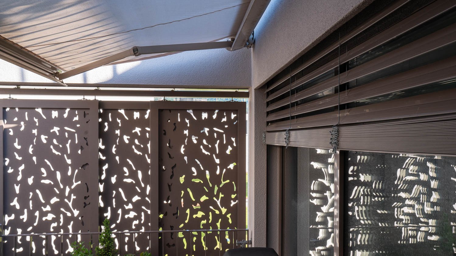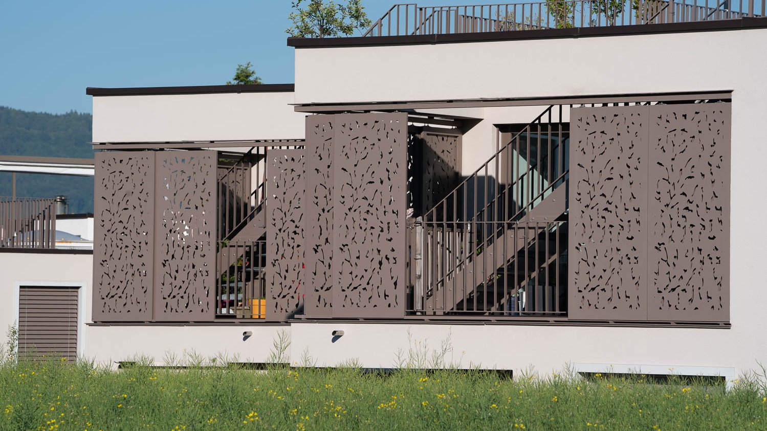 D’une part pour des raisons purement fonctionnelles. Comme ils sont mobiles et faciles à régler, ils protègent non seulement de la pénétration de lumière, mais aussi des regards indiscrets. Le motif de perforations laisse passer assez de lumière même lorsque le volet est fermé, ce qui prévient l’élévation de la température à l’intérieur. D’autre part, c’est leur esthétique qui m’a plu. Ils s’intègrent harmonieusement à la façade sous forme de détail élégant et lui confèrent une identité visuelle autonome et inimitable.