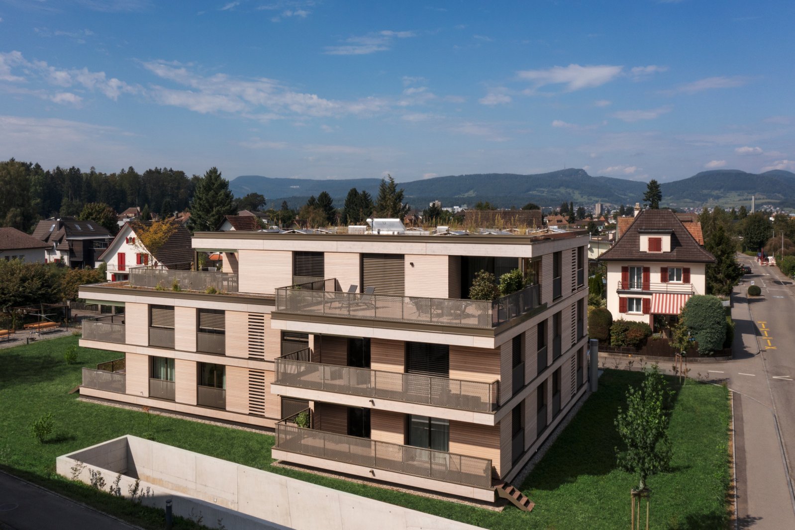 A l’emplacement d’un ancien presbytère implanté dans un charmant verger, c'est désormais un immeuble de deux étages doté de généreuses façades vitrées qui se fond harmonieusement dans l'ancien jardin arboré et le quartier environnant. Des balcons découpés et des lamelles en bois horizontales confèrent au bâtiment une silhouette légère, semblable à celle d’un pavillon. L'édifice abrite huit appartements en copropriété, respectivement trois au rez-de-chaussée et au premier étage, et deux appartements dans les combles, tous équipés d’une loggia ou d’une terrasse. Construit conformément à la norme Minergie P, le bâtiment offre à ses résidents une excellente rentabilité énergétique, doublée d'un confort d’habitation inégalé.