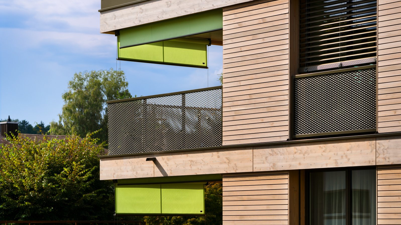 Des fenêtres qui s’étendent du sol au plafond transforment les pièces en véritables oasis de bien-être. Baignées de lumière, elles donnent l’impression d'une communion entre la nature et l’habitat. Les trois systèmes de protection contre le soleil différents participent à instaurer d'agréables conditions de luminosité, tant à l’intérieur qu’à l’extérieur. Les concepteurs ont délibérément choisi des couleurs terreuses, en harmonie avec les autres matériaux de construction, et comme un clin d'œil au jardin. L’apport de lumière du jour peut être commandé individuellement sur toutes les fenêtres, grâce à des stores à lamelles reliées (VR 90) réglables en fonction des besoins des résidents. Au niveau des places assises, les stores en toile verticaux VS 150 assurent une protection contre le soleil remarquable, tout en affichant une esthétique convaincante. Comme un montage standard n’était pas possible ici, des supports spéciaux ont été fabriqués sur mesure pour le guidage par câble. Ceux-ci sont fixés directement sur le périmètre de la balustrade. L'aménagement des combles a nécessité une étroite collaboration avec le fabricant de la façade et le constructeur métallique. Un cadre en bois a été spécialement construit pour le montage des marquises normalisées intemporelles NGM 20.