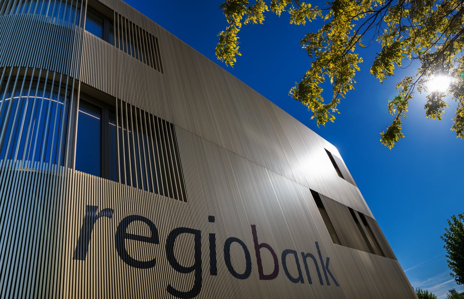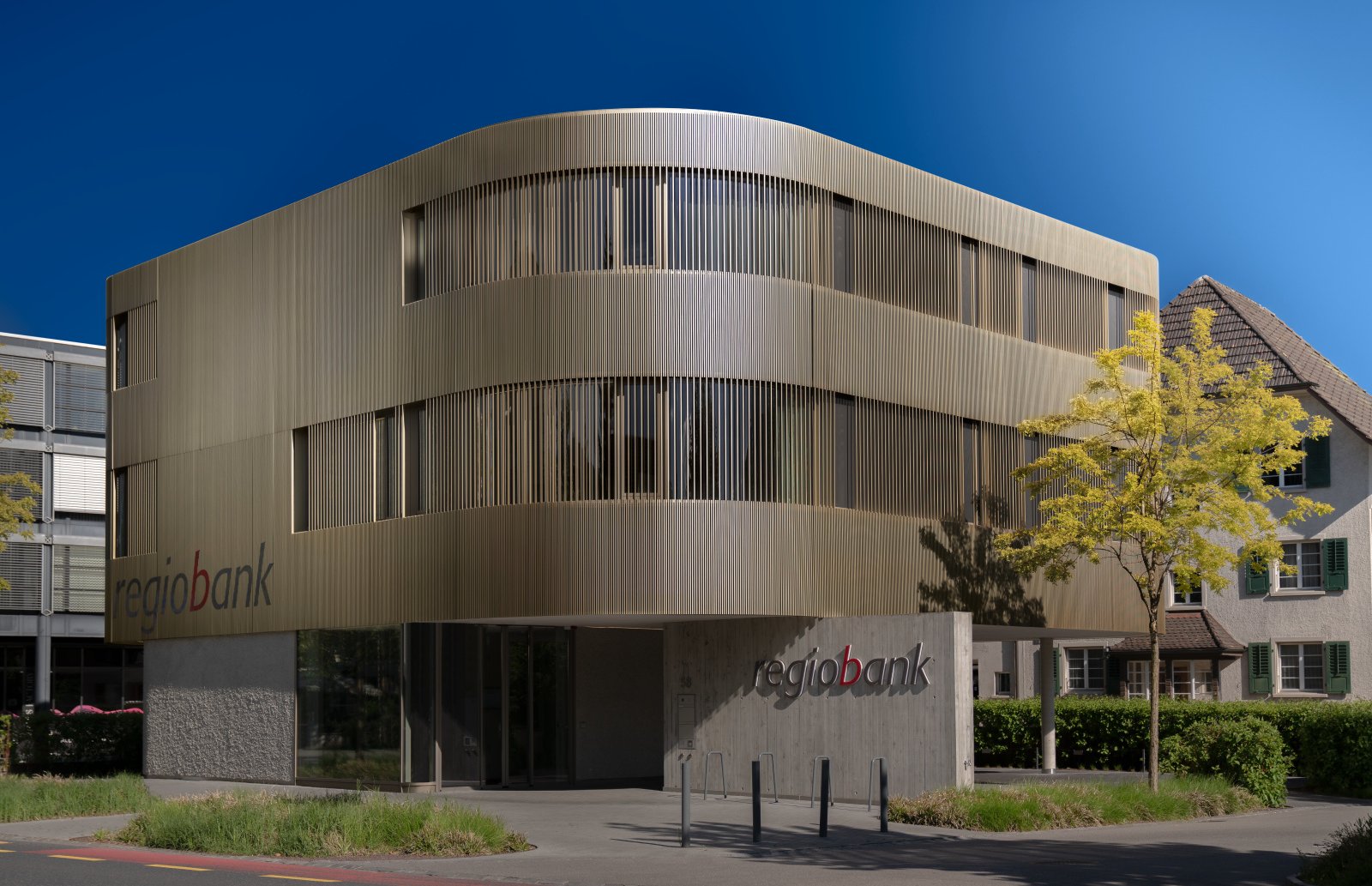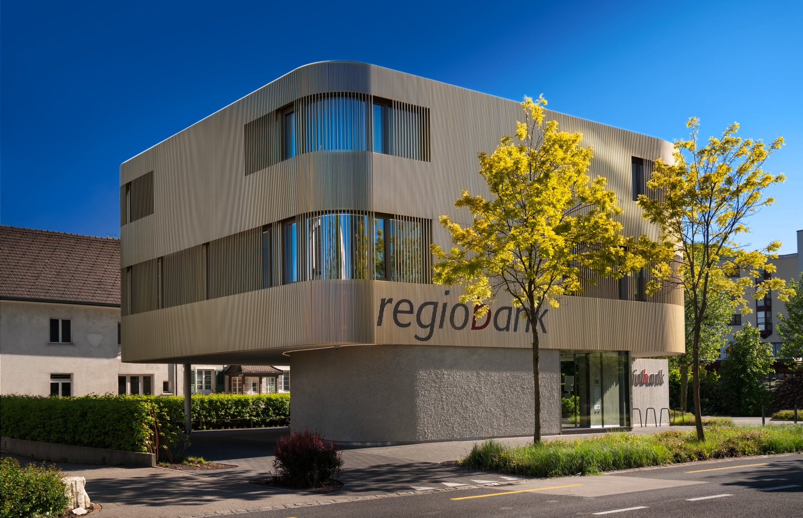 Plus moderne, plus fraîche, plus dynamique: la nouvelle agence Regiobank de Zuchwil séduit par son apparence représentative. Le bâtiment de la banque a été construit sur un petit terrain. Les deux étages supérieures flottent visuellement au-dessus d’un rez-de-chaussée décalé, ce qui crée suffisamment de places de parking et de l’espace pour les voitures qui se garent devant les distributeurs automatiques de billets accessibles de telle sorte que les clients ne sont pas tenus de sortir de leur véhicule.